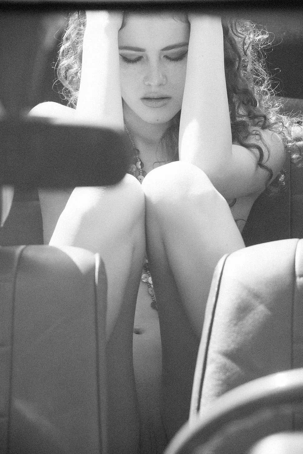 “I Belong Here” – erotische Aktfotografie mit einer Frau im Oldtimer. Sonnenlicht, Haut und ein nachdenklicher Moment auf dem Rücksitz.