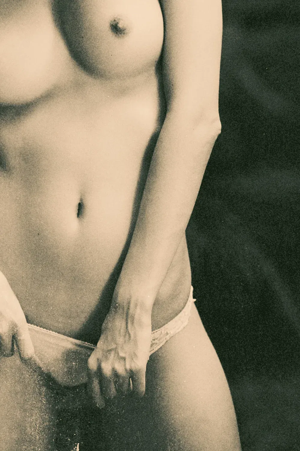 Forget the gangster romance. This is just her — hat, pearls, and an aura that smells like sin. Erotic nude photography plays with light, shadow, and a nostalgia that isn’t harmless. It needs no Clyde, no accomplices. Only that look that says: come closer — or leave.