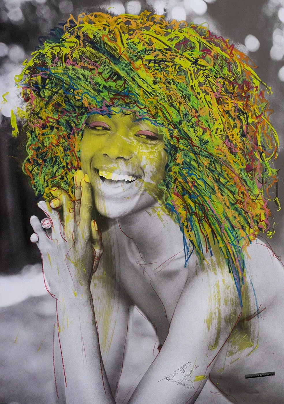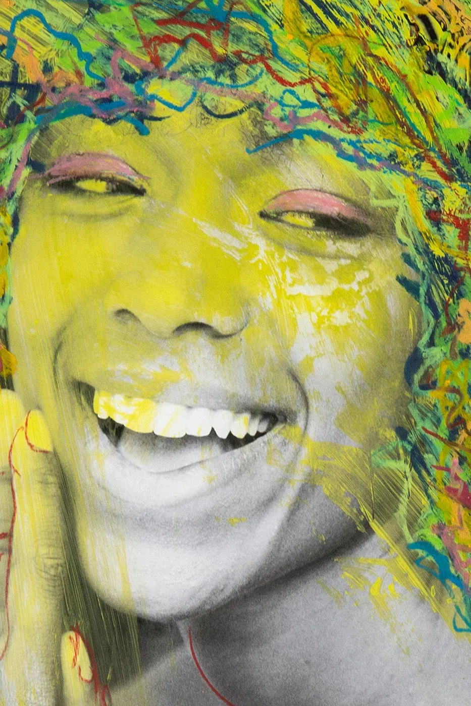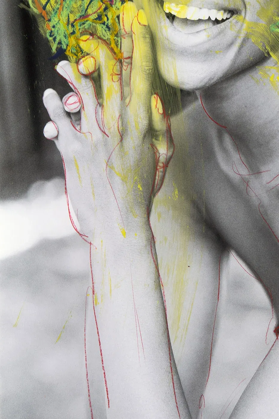 A genuine laugh needs no filters. Here you see pure joy, covered in color, as if someone had done away with the grey of everyday life in one fell swoop. Wax crayon, overpainting, photography – contemporary collage art that feels like a rush. This laughter won’t let you go. It doesn’t care about conventions. It shows you what art is really like: wild, honest and free. Let yourself be infected – a little madness never hurt anyone.