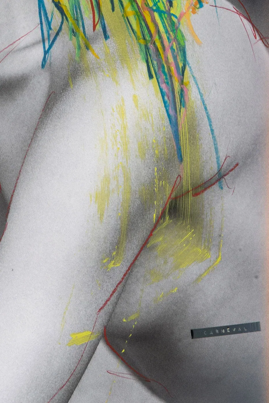 Provocative, contemporary collage art: overpainting with wax crayon on photo paper, 70 x 100 cm, unique, signed and certified.
