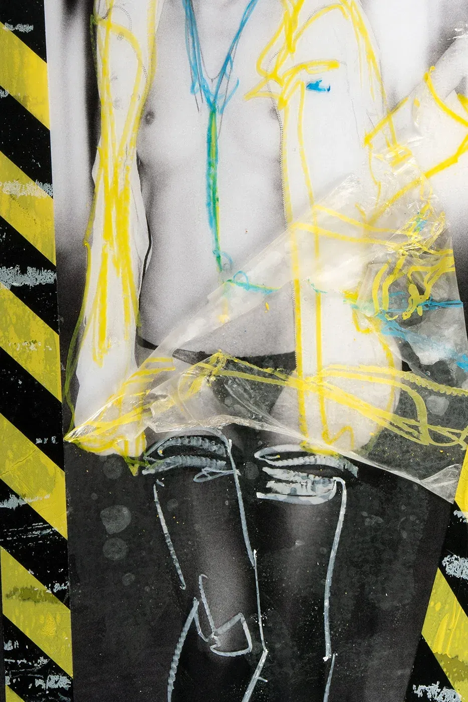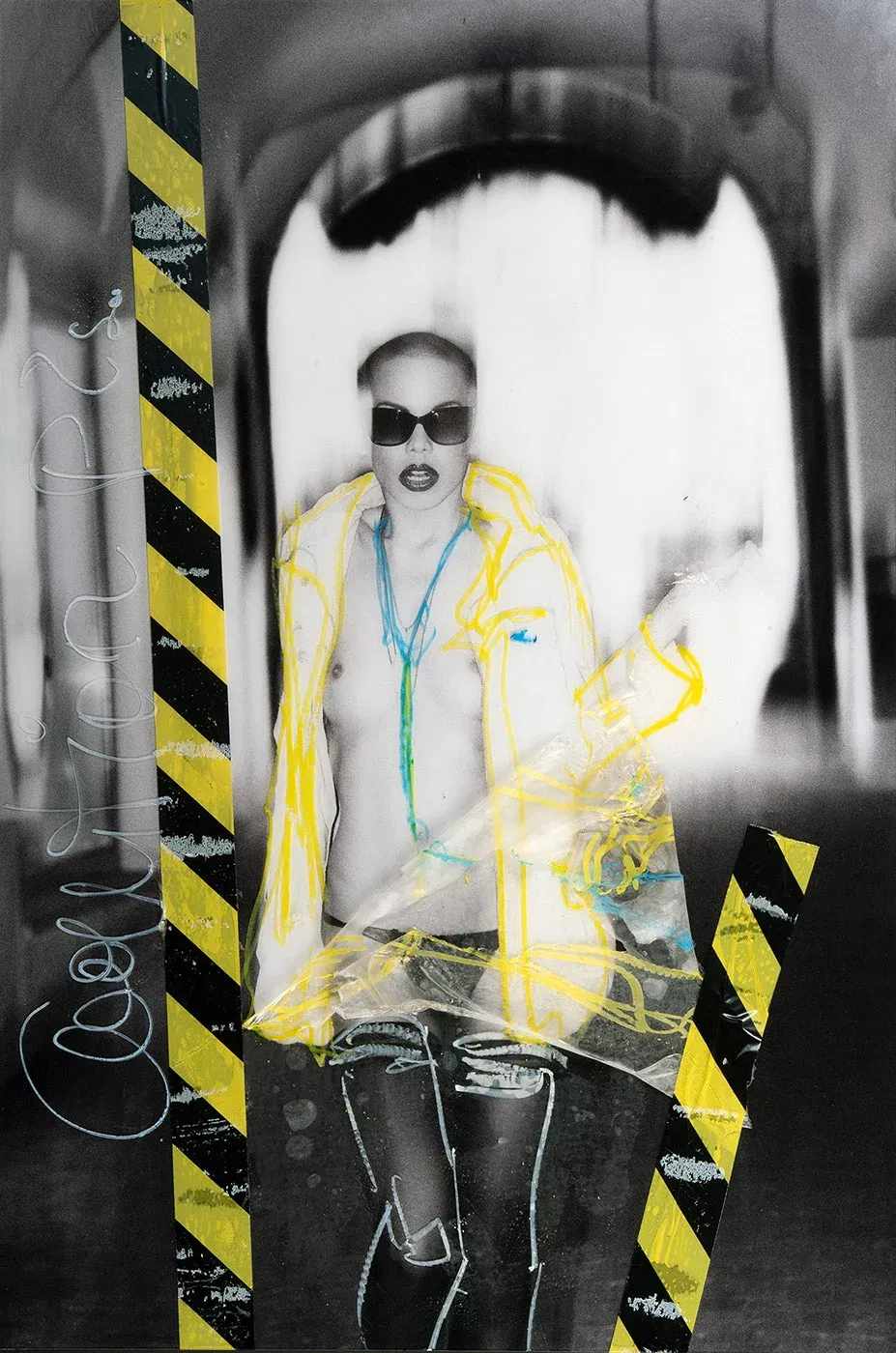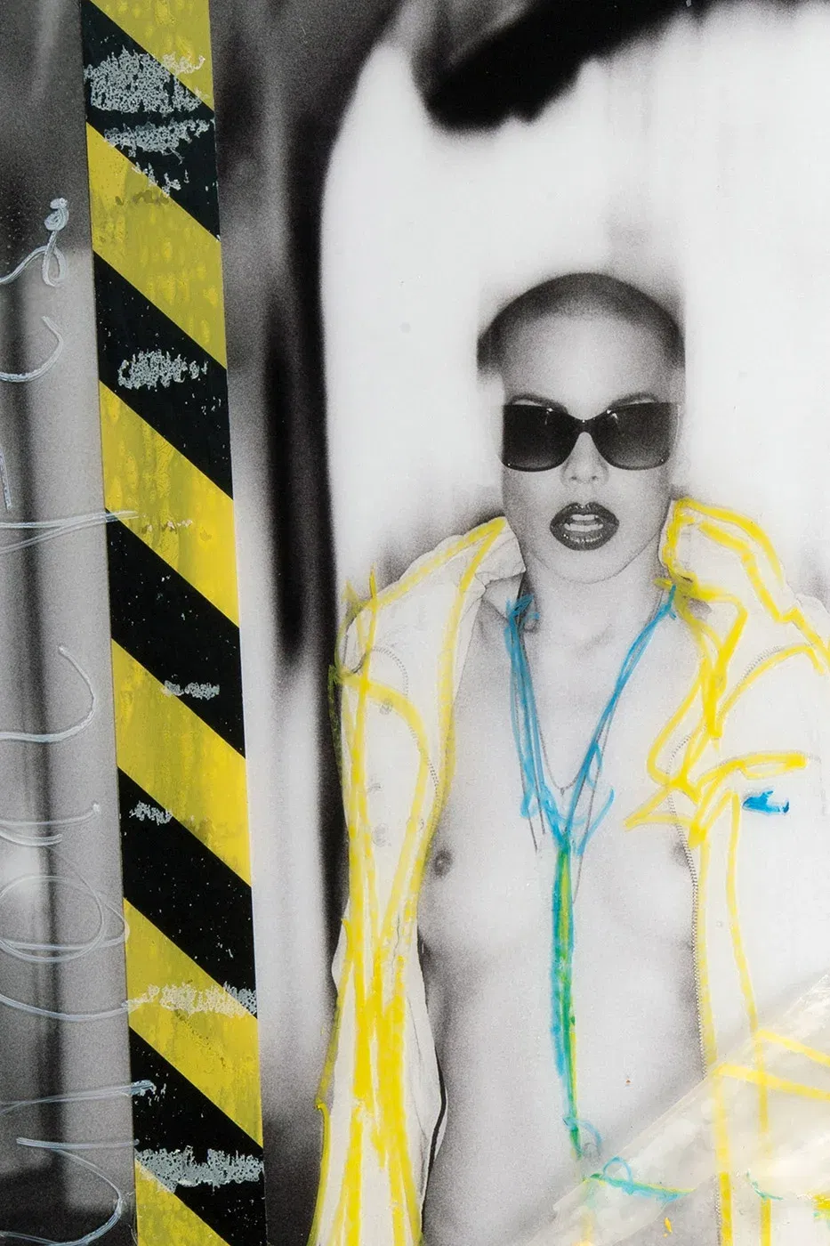 She goes her way, unchecked, as if she were the fucking boss of this world. Her upper body exposed, not for you, not for some greedy look, but on principle. The yellow barrier tapes on the acrylic glass are not a warning, but an invitation to rub up against her posture. Contemporary collage art that doesn’t ask you if you’re ready. The breasts? Just extras. What counts here is the attitude, the presence, the unmistakable message: I am here, I am real, and I do what I want. If you can’t cope with that, you’d be better off buying posters from the DIY store.