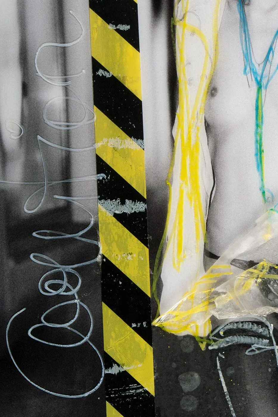 Contemporary collage art with paint pen, adhesive tape and plastic film on acrylic glass. A powerful, provocative scene that radiates freedom and determination.