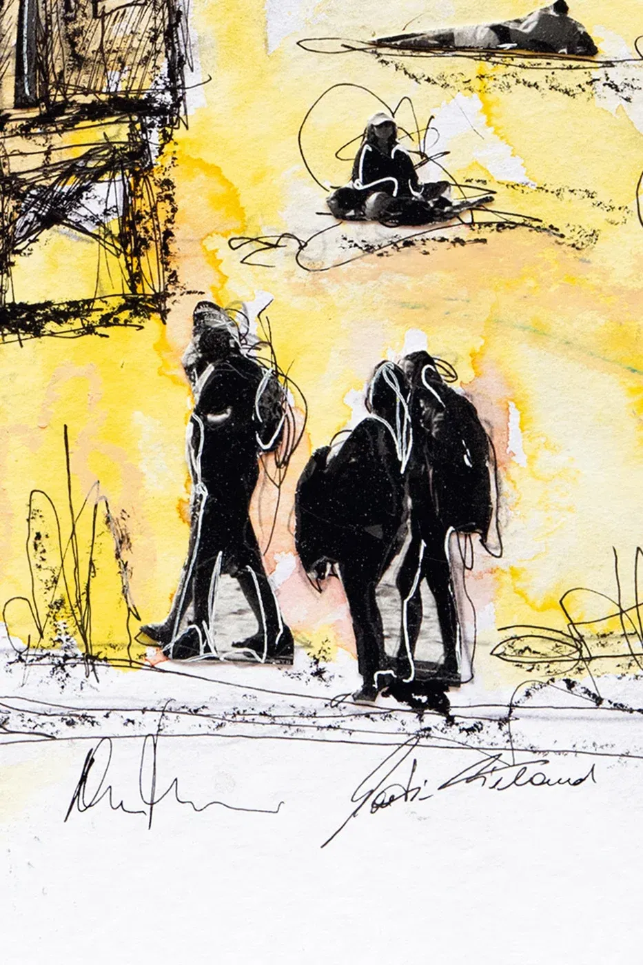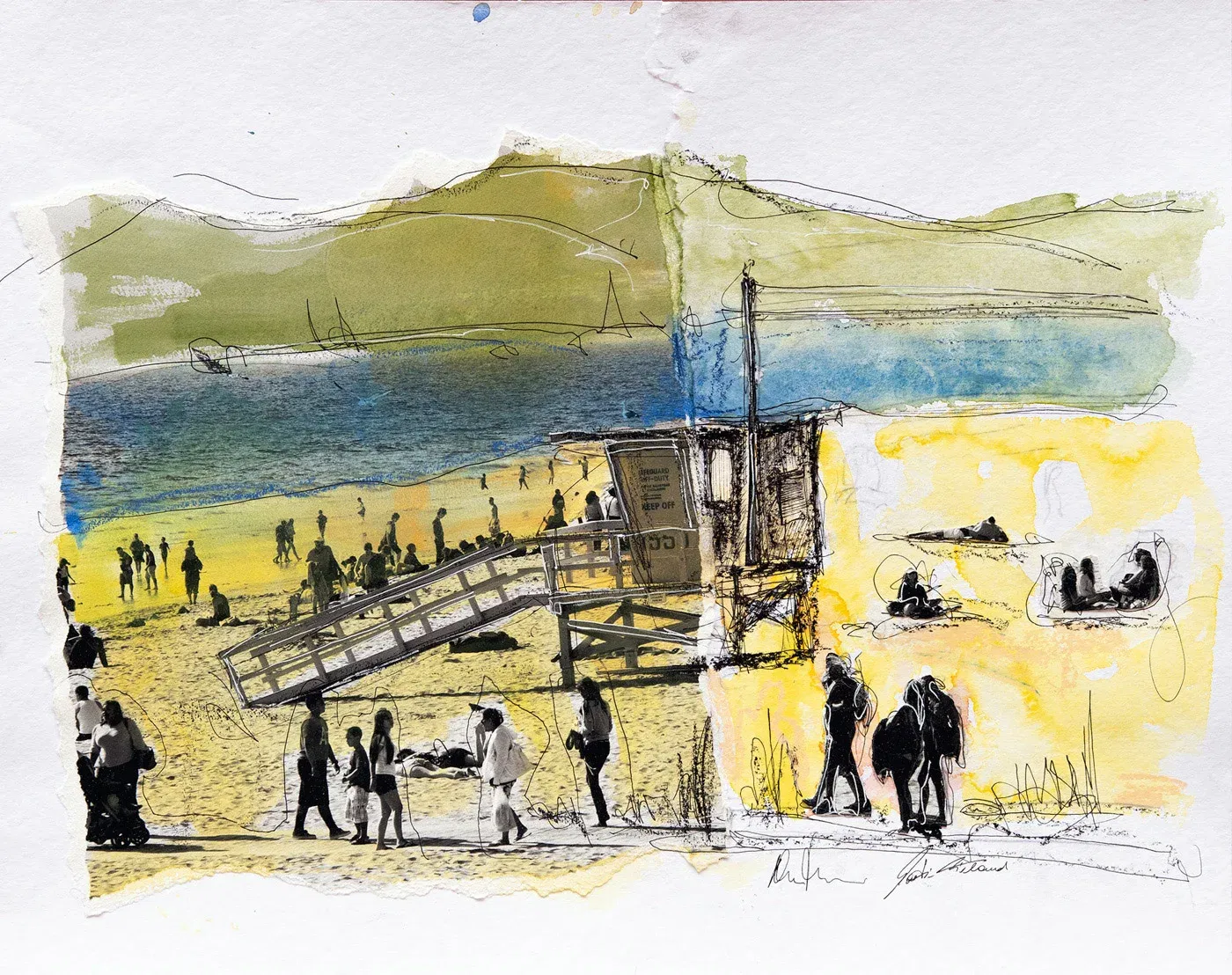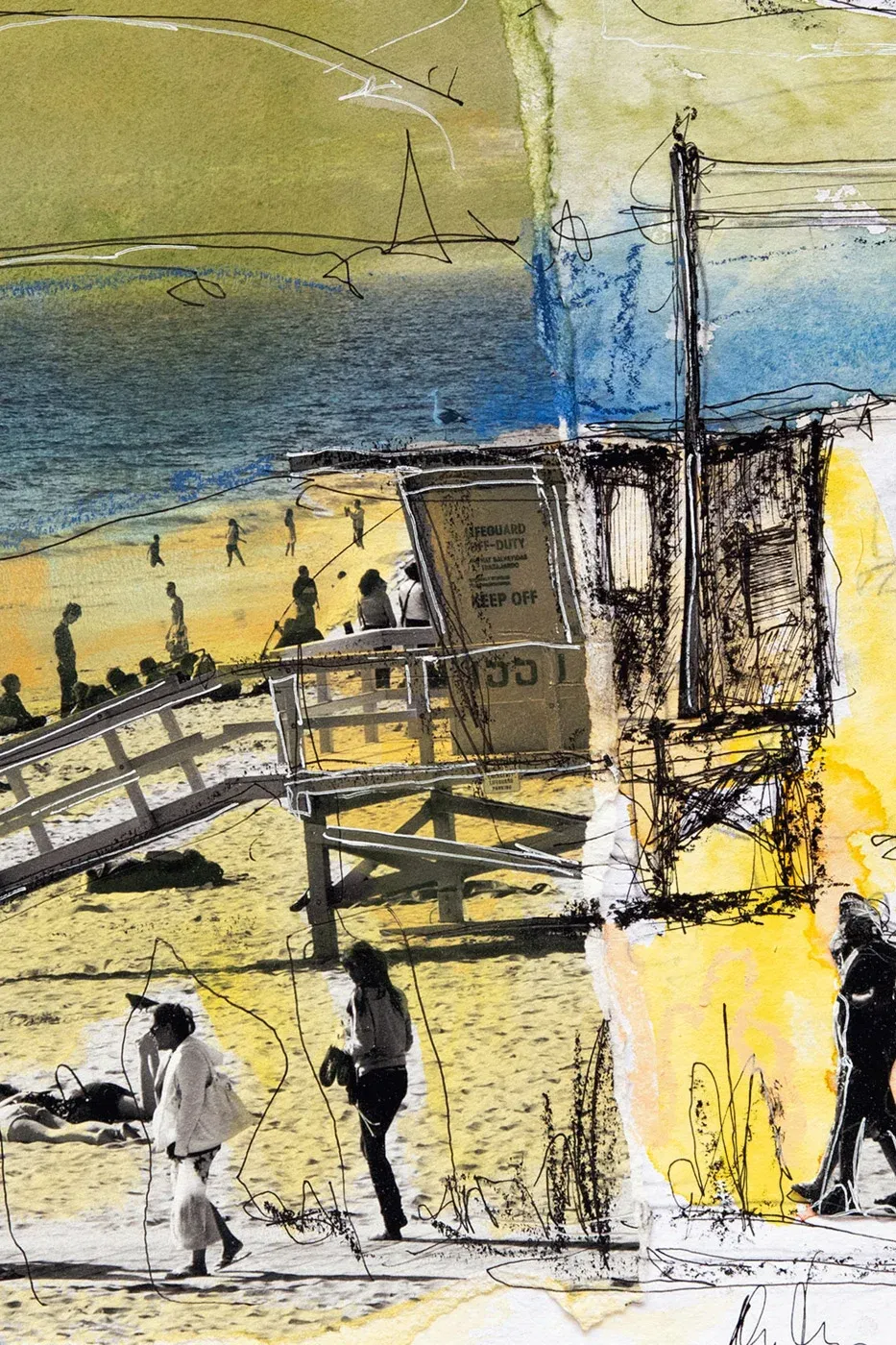 A day at the beach, somewhere between reality and memory. The sun is burning, the sand is sticky, the sea beckons. People walk, sit, lie down, immerse themselves in their own stories. A rescue tower looms in the scenery, dotted, drawn, as if it were only here temporarily. Modern landscape art that captures a snapshot with ink and watercolor – but does not freeze. Colors run out, lines break off, everything remains in motion. If you look closely, you will discover more than just a beach. Perhaps yourself.
