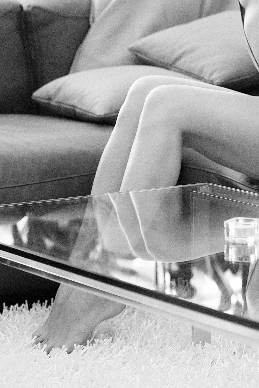 Erotic nude photography on leather. Hair as a curtain, thoughts as a dirtbag. She is not waiting for the prince – she is waiting for the moment when reason flees through the door. The light is soft, the imagination hard. Here, between glass and leather, it is not art that is created, but lust for celluloid. A picture that does not ask, but commands: Look, damn it!