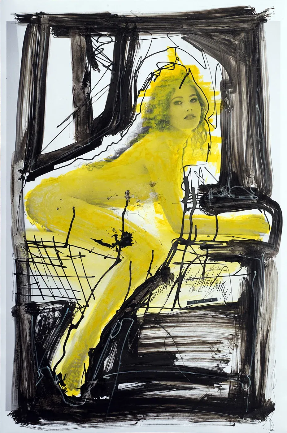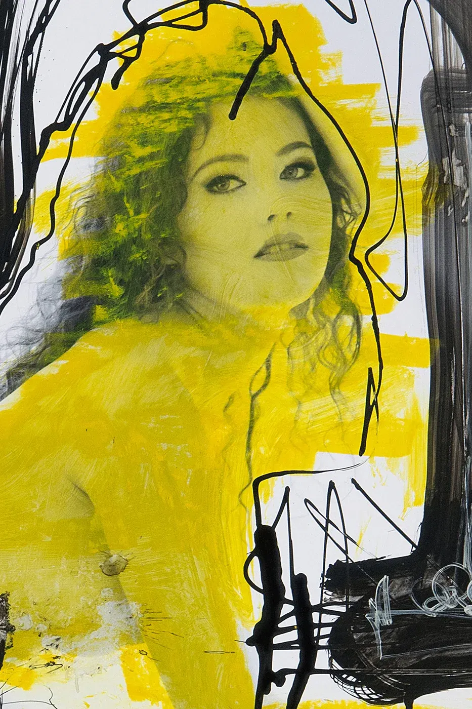 Some people have sunshine in their hearts, others wear it like armor. This woman has it in her whole body – uncompromising, non-conformist, like a damned sunrise that refuses to crawl back into the shadows. She glows yellow out of the frame, defying the black lines that dance around her like prison bars. Contemporary collage art that wants to show itself – with all its angular beauty. An explosion on photographic paper – raw, real and definitely not for your mother-in-law’s living room. This is art that doesn’t ask you if it can stay – it comes in, sits down and stays.