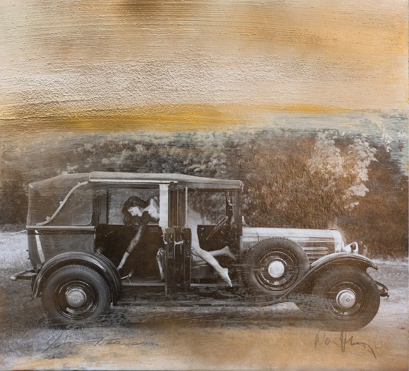 Contemporary pop art – “Faster Please” is more than just a work of art – it is an energetic meeting of retro and modern. The motif of a woman in the middle of an iconic automobile scene combines past and present in a provocative, unfiltered way. Sepia and gold tones emphasize the powerful dynamics, while overpainting reinforces the impression of movement and depth. Inspired by pioneers such as Arnulf Rainer and Franz West, this work breaks with convention and creates space for new perspectives. The combination of classical techniques and contemporary design gives “Faster Please” its unmistakable signature. This work appeals to both collectors and lovers of modern art who are looking for a piece with character.