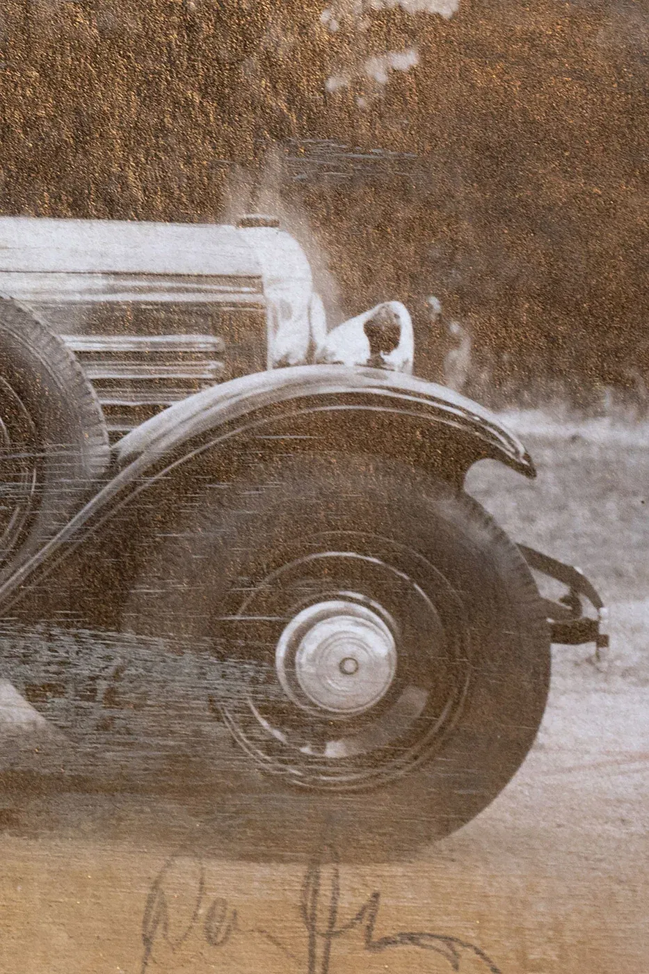 The use of gold spray and sand in combination with photographic elements shows how the interplay of materials can create something completely new. The raw texture emphasizes the image and gives it a physical presence that can be felt. “Faster Please” invites the viewer to pause and take in the details – each element tells a story that goes far beyond the visible motif.