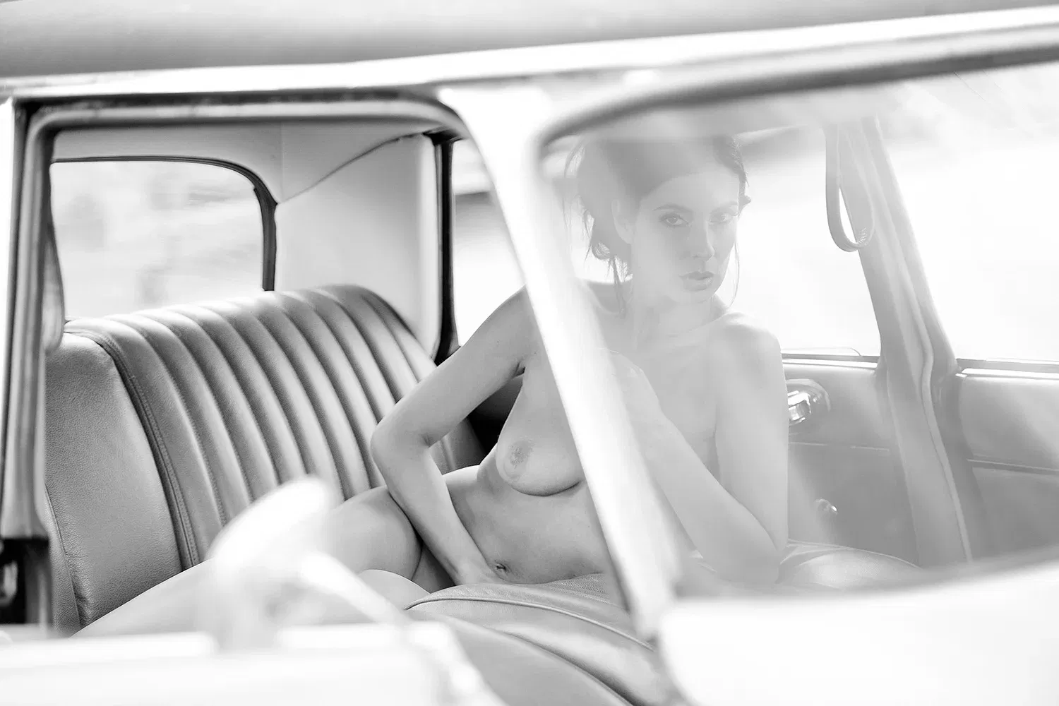 A play of reflections unfolds between chrome and shadow – Front Row is erotic nude photography full of atmosphere.