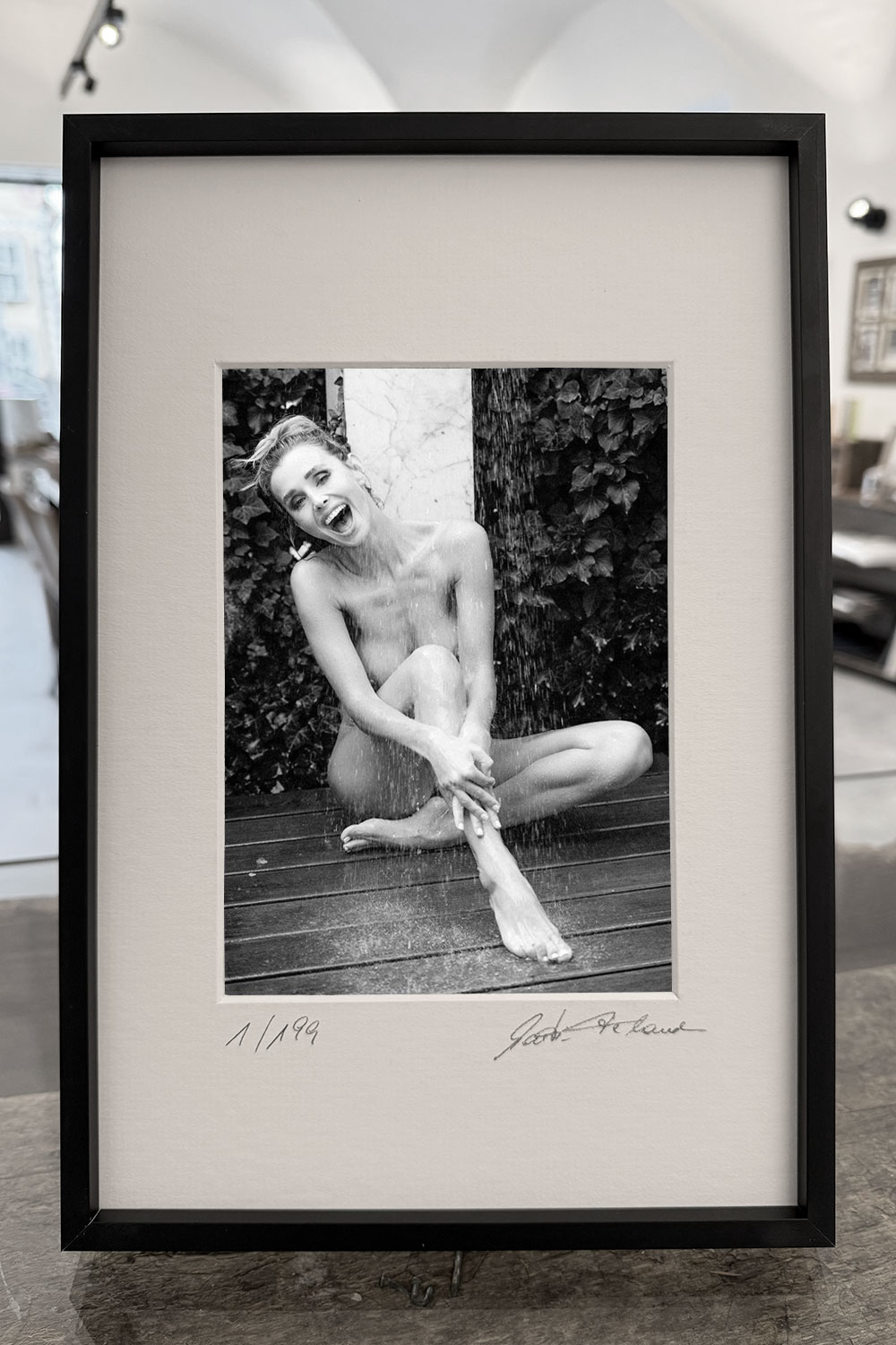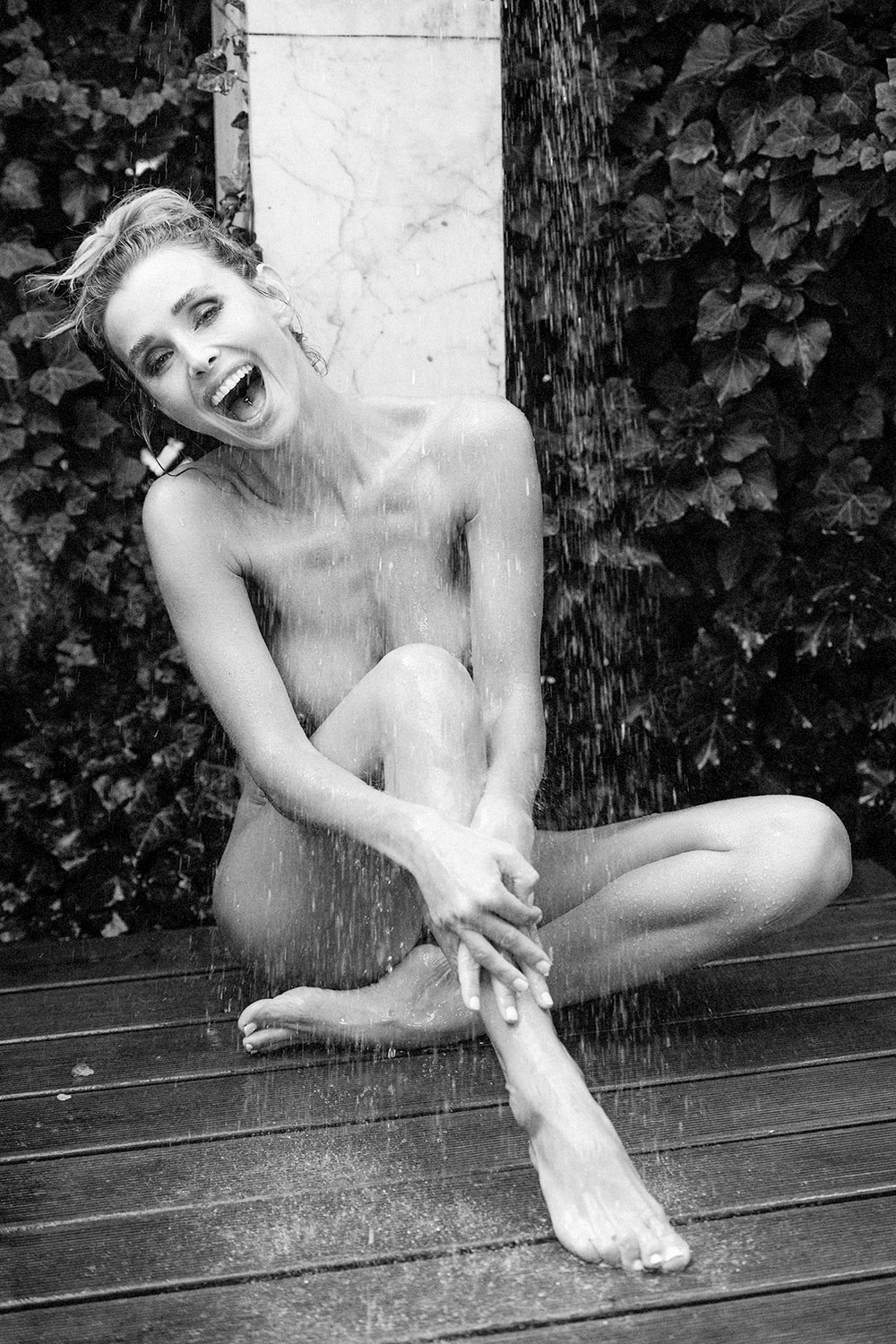 Naked body, wet wood, a waterfall from a garden hose. She sits in the stream, mouth half open, turning the cold shock into something close to laughter. Everything is sharp: drops, shine, tension in the pose. Green behind her, but no romance in front of it. 199 pieces, online until 15.03.2026 — never available again after that.