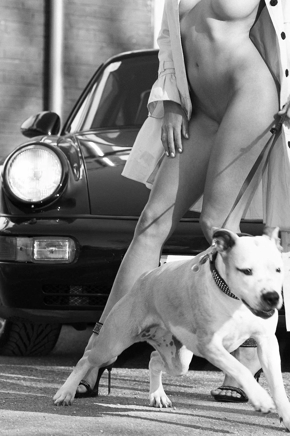 The asphalt steams, the dog pulls, and she? She stays. Unwavering. Erotic nude photography that doesn’t ask if she’s allowed. Her trench coat open, her skin cool, her gaze like a knife blade. The 911 in the background – a classic, just like her. This scene smells of gasoline, power and a night in which nothing is forbidden. The leash is just an ironic gesture, she leads anyway. This is not about niceties. It’s about attitude, lust and a woman who knows exactly what she’s doing.