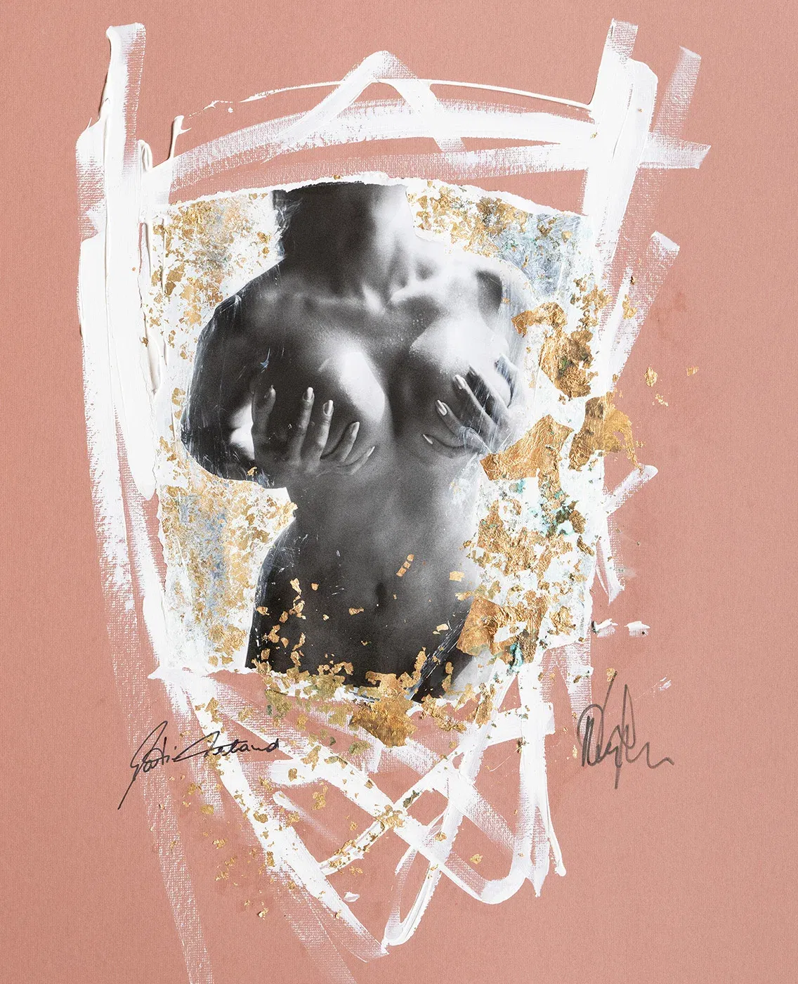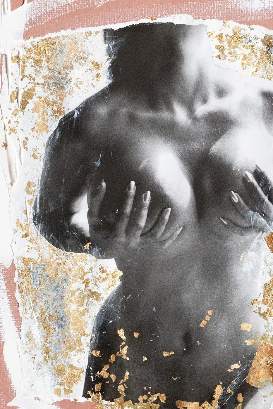 Provocative collage with original photography, gold leaf and spray paint. Contemporary collage art that combines raw sensuality with aesthetics.