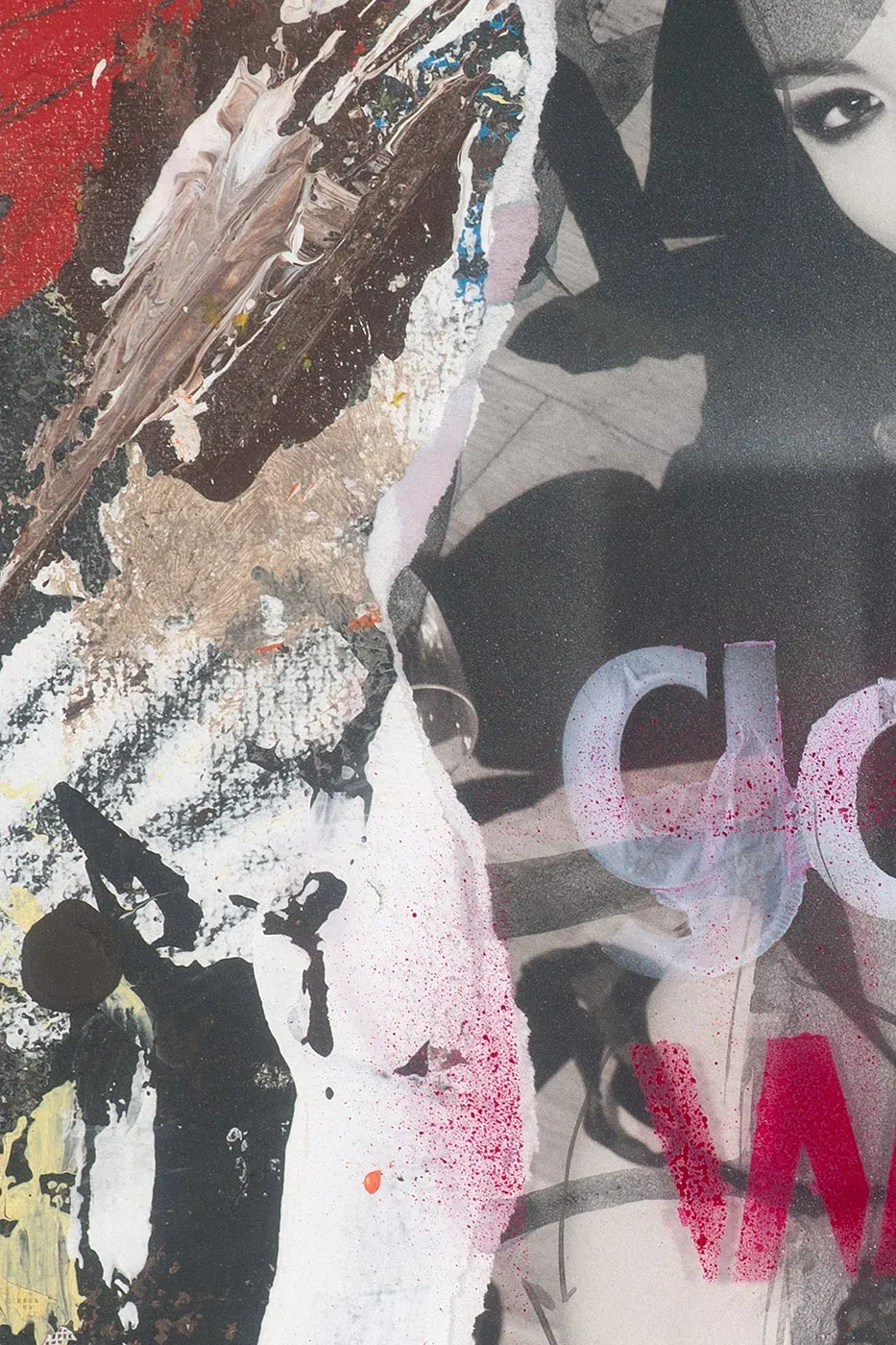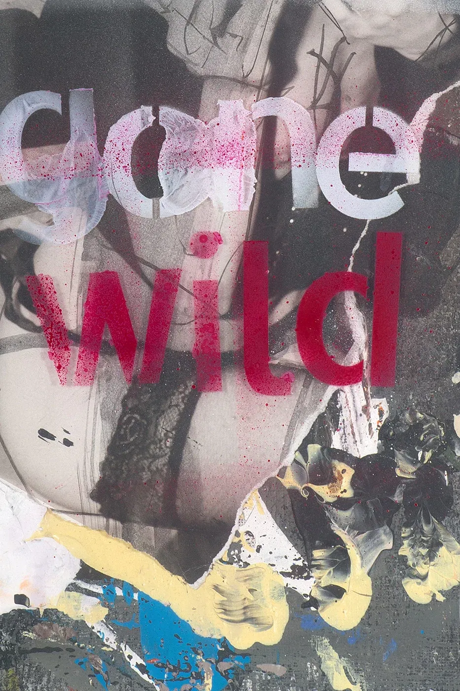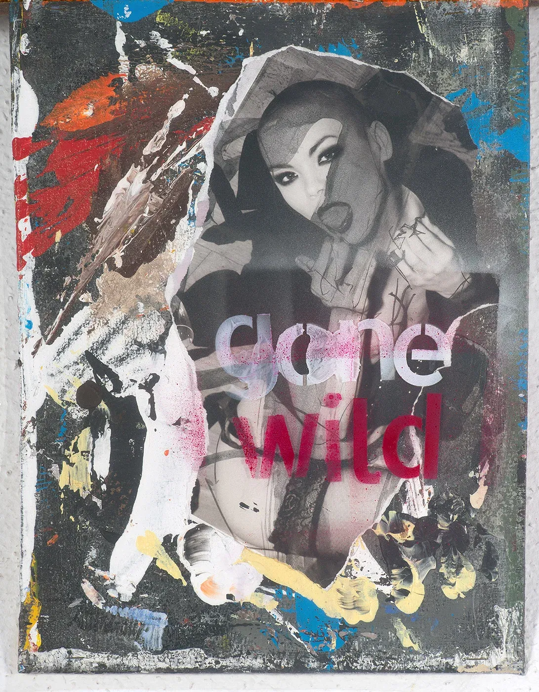 Contemporary collage art with spray paint, acrylic and original photography on cardboard. A provocative, hand-signed unique piece.
