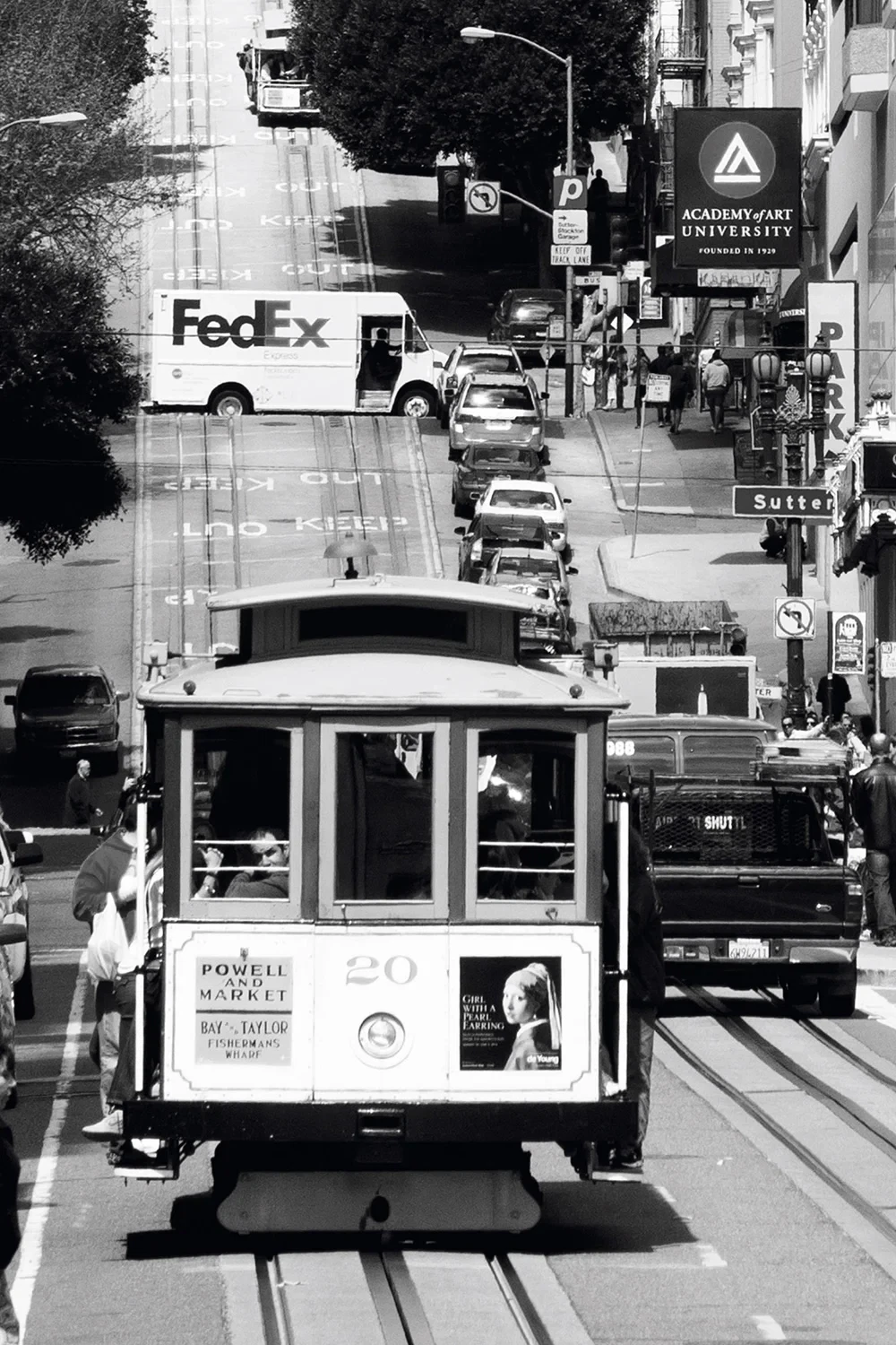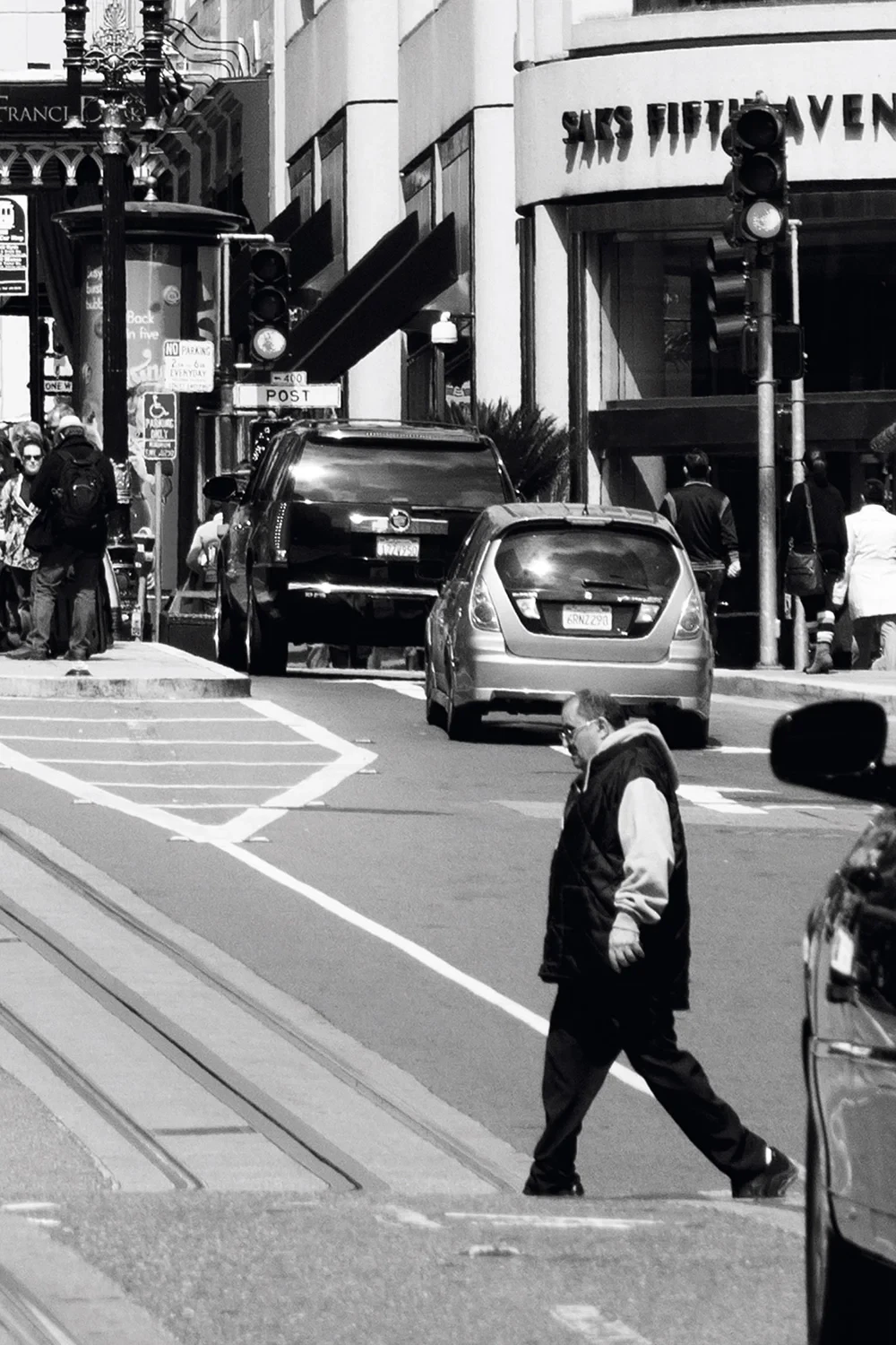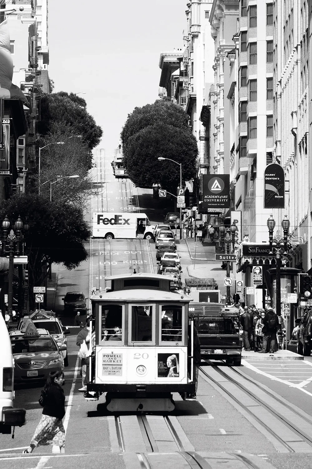 Some cities are easy to walk, San Francisco is not. Here, every step is a decision: uphill or downhill, forwards or standing still. The asphalt is rough, the air tastes of the sea and machine oil, and while you gasp for air, the cable cars keep on going. They are in no hurry, but they don’t stand still either – just like the city itself. There are no straight lines here, no simple paths, just movement in all directions. Perhaps this is exactly what street photography is: documenting places that never stand still, people who live to their own rhythm, streets that tell stories without saying a word.