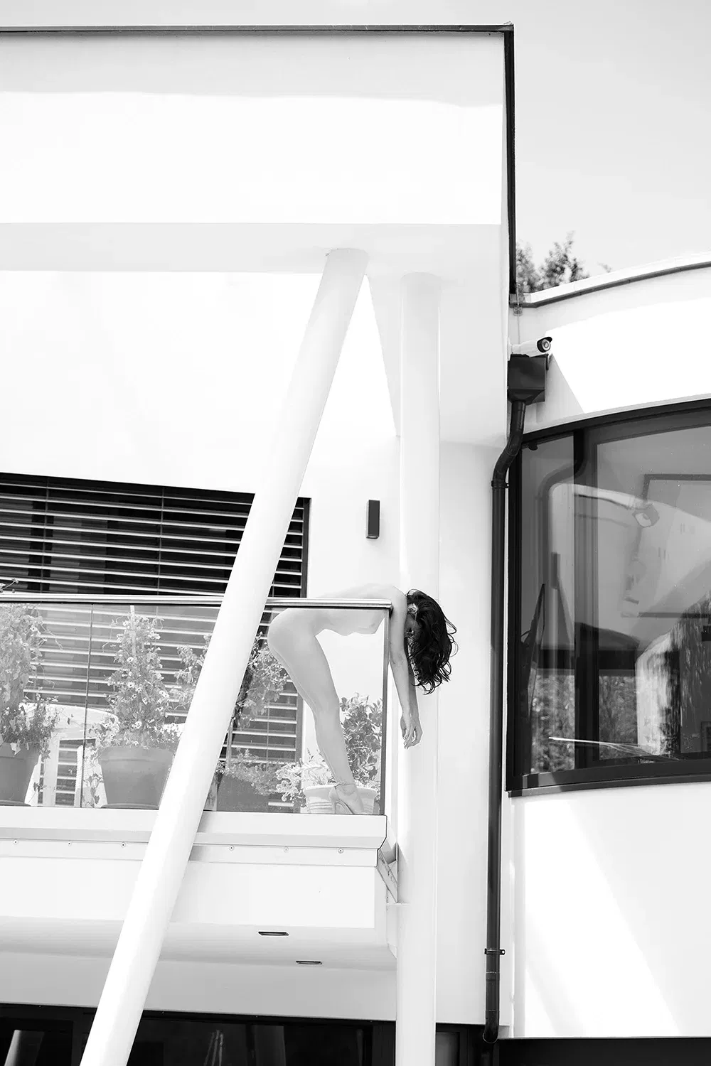 A designer house, one glass too many, a woman leaning over the railing as if waiting for a miracle. Or simply for the next chaos. Erotic nude photography with a pinch of decadence and a hint of self-destruction.