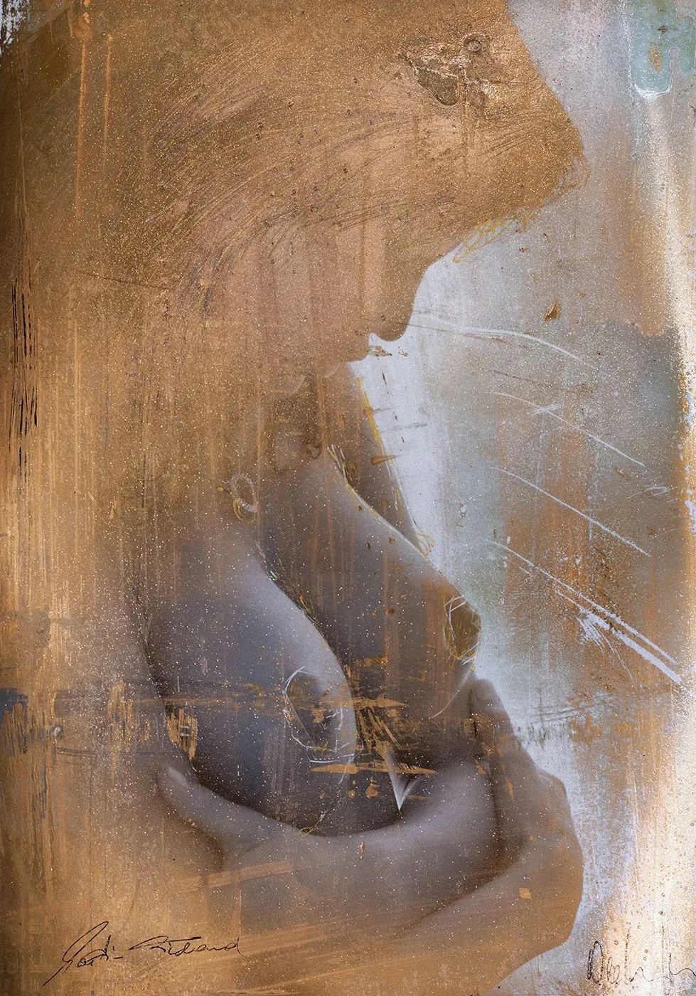 Sometimes a moment, a touch, an unfinished thought is enough. The skin shimmers like a memory that refuses to fade. Gold and glitter? That’s camouflage. Her arms wrapped around her chest as if she could stop time. This contemporary collage art is not a piece of jewelry for sterile walls – it is the whisper of a past pleasure.