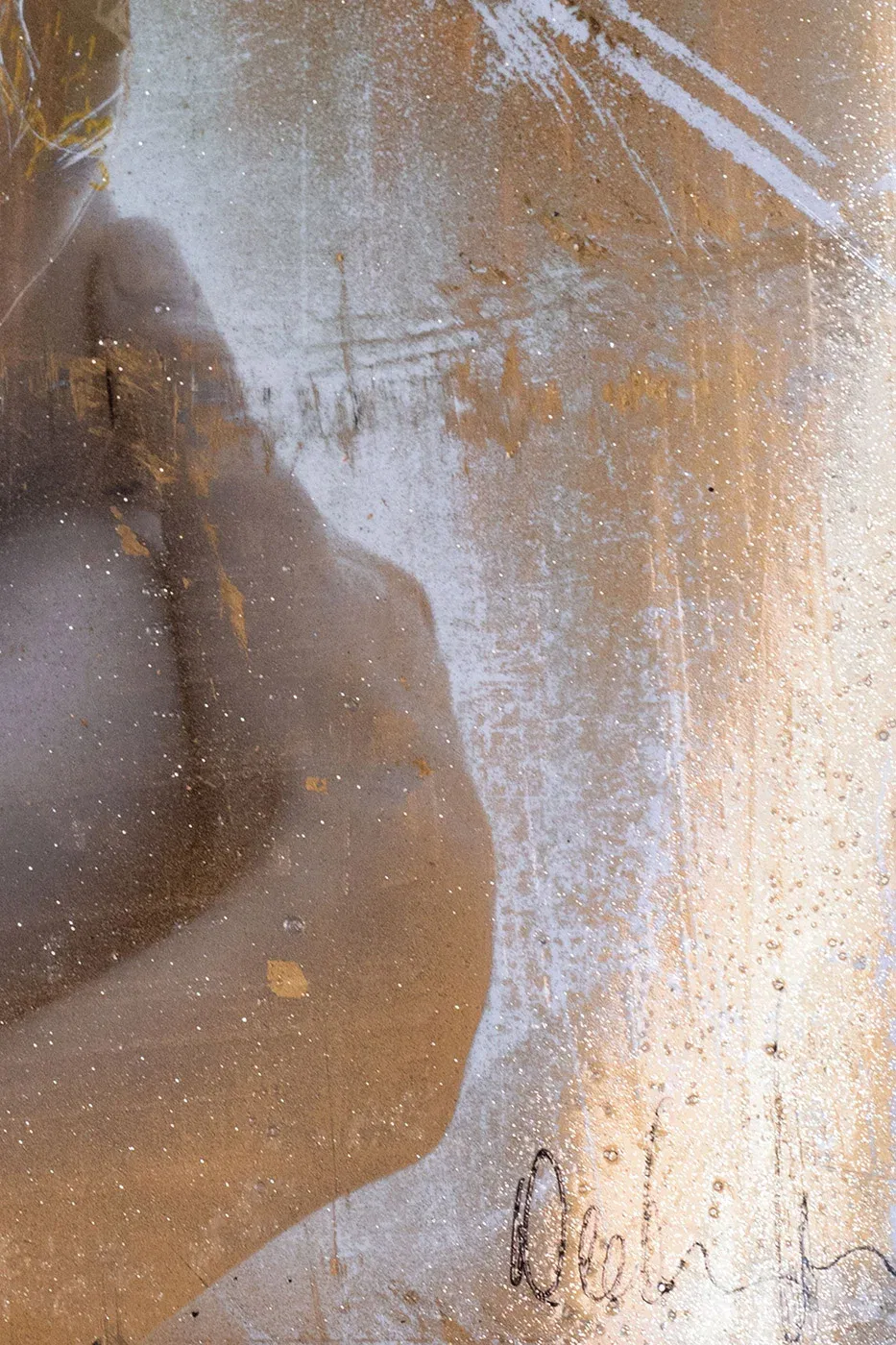 Each work in the Modern Madonnas series is a unique original – analog, genuine, tangible. There is no retouching here, it is layered, torn, applied. Layer by layer, different materials are applied, reworked, destroyed and rebuilt until the surface not only develops depth, but also its very own dynamic.
