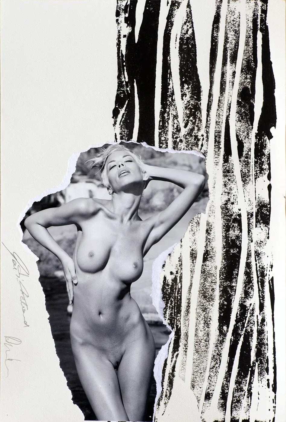 Contemporary collage art with printer’s ink and original photography on drawing paper. Provocative nude in 20.7 x 29.8 cm format, certified unique.