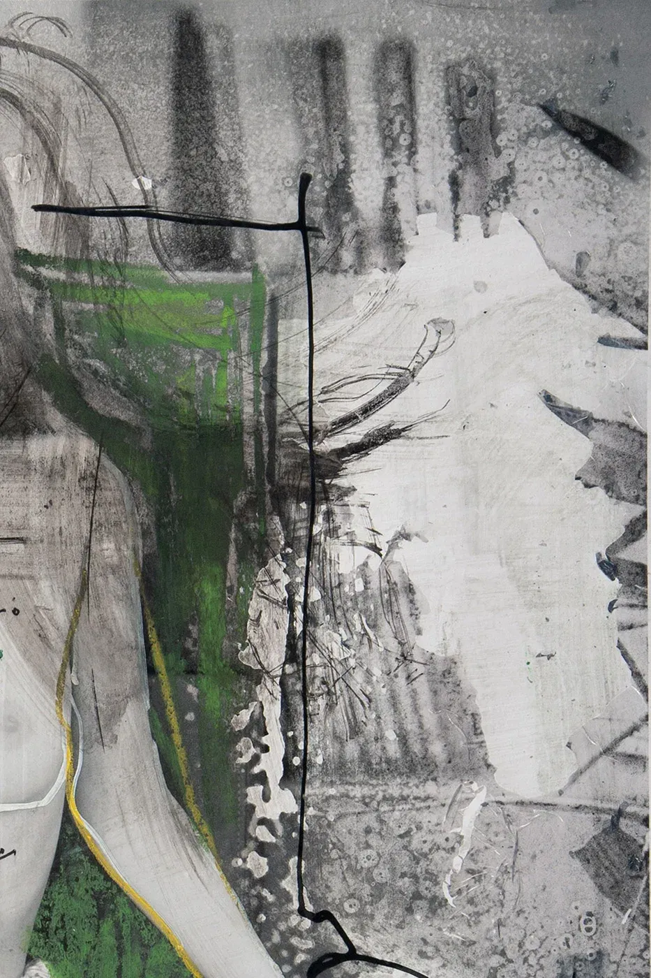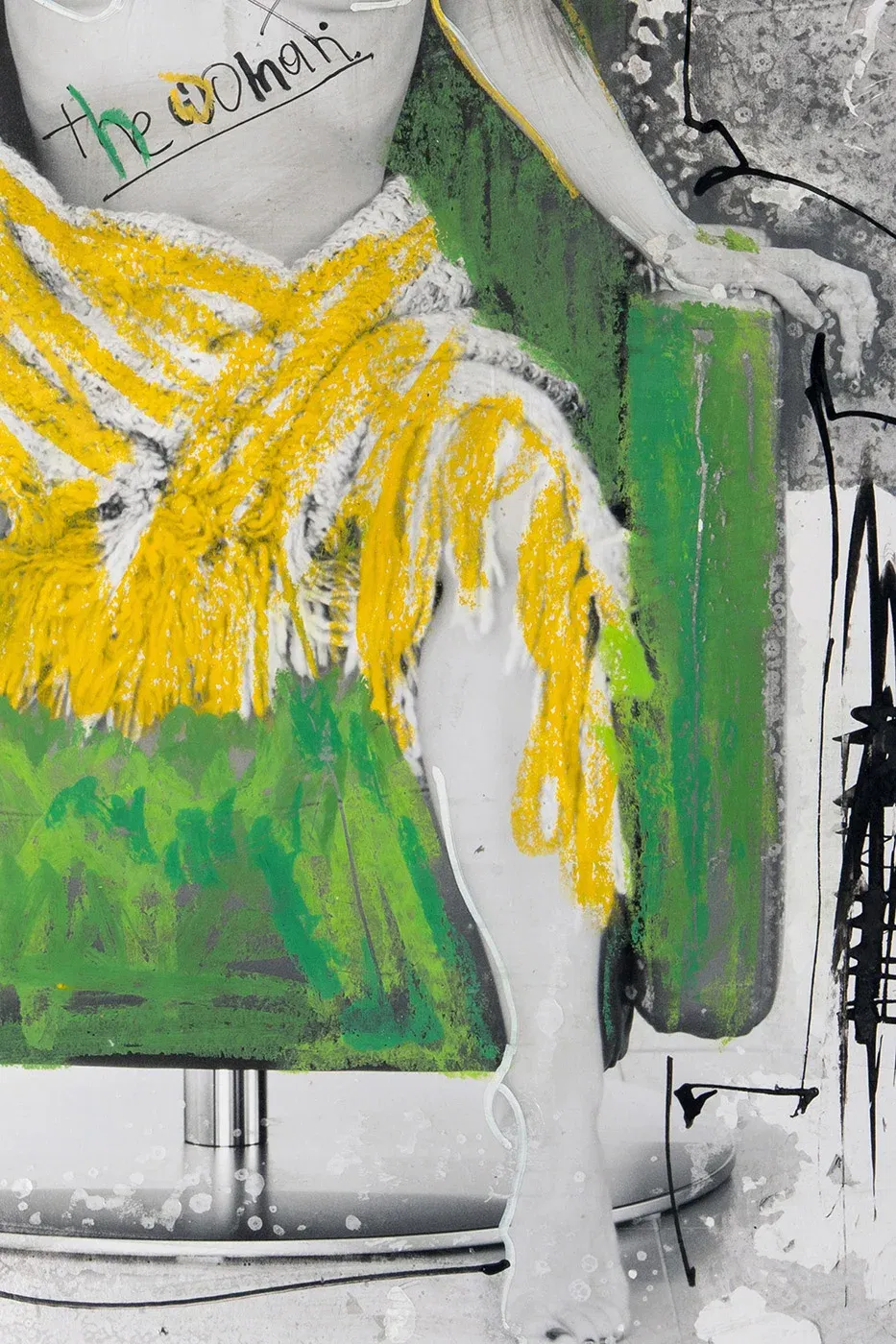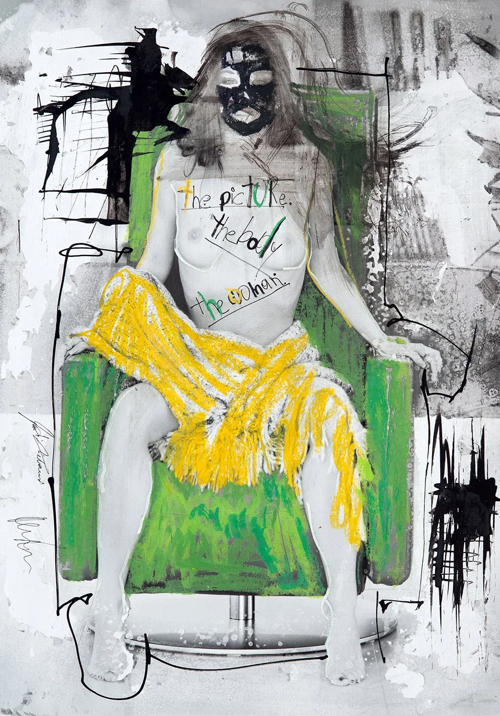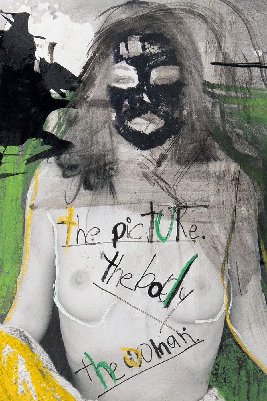Provocative, contemporary collage art: The Picture, The Body, The Woman. Oil pastel, opaque white, ink on FineArt Baryta, 50 x 70 cm.