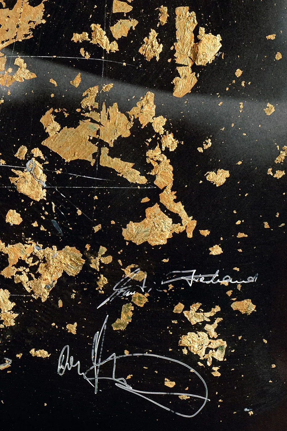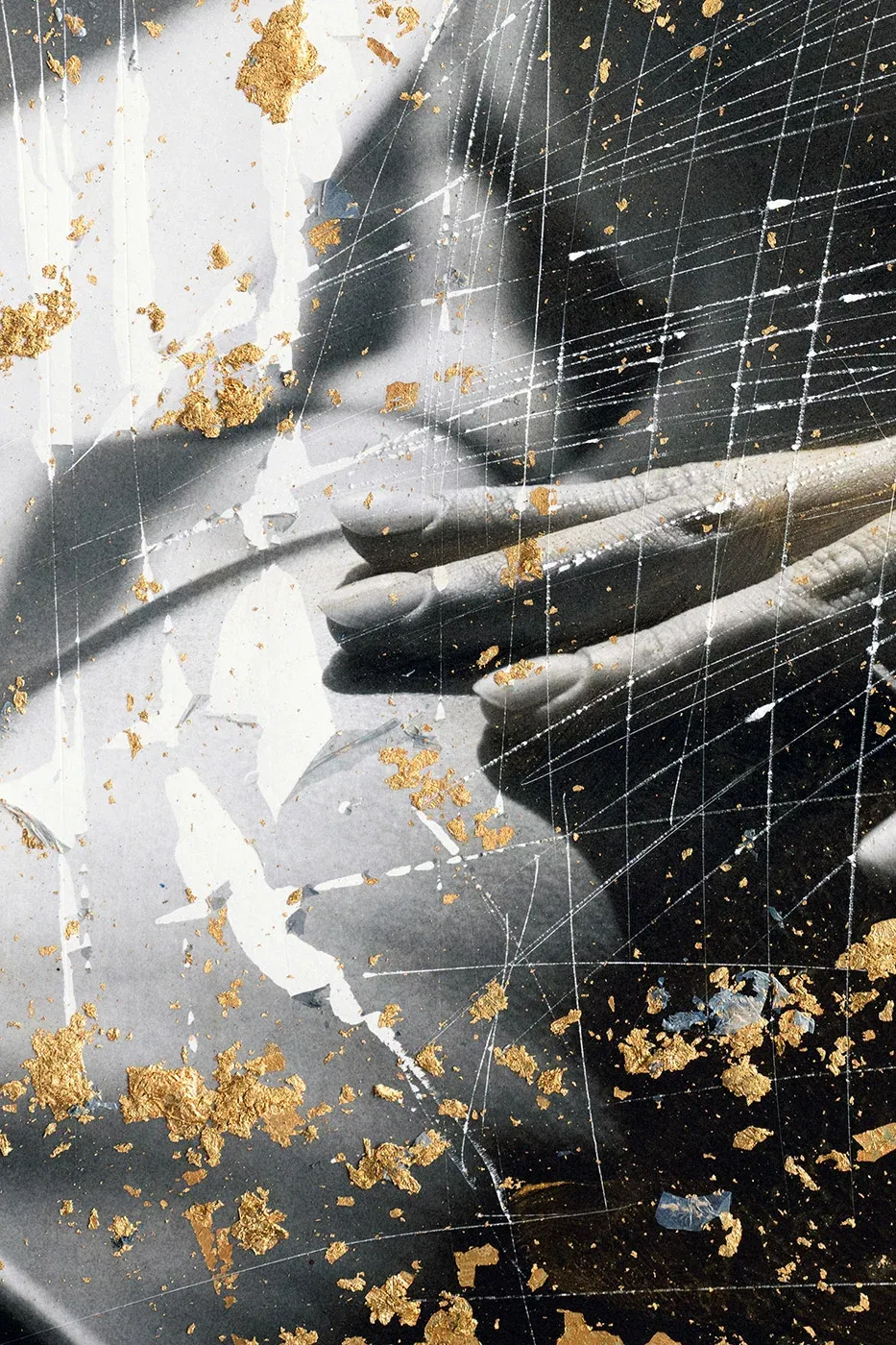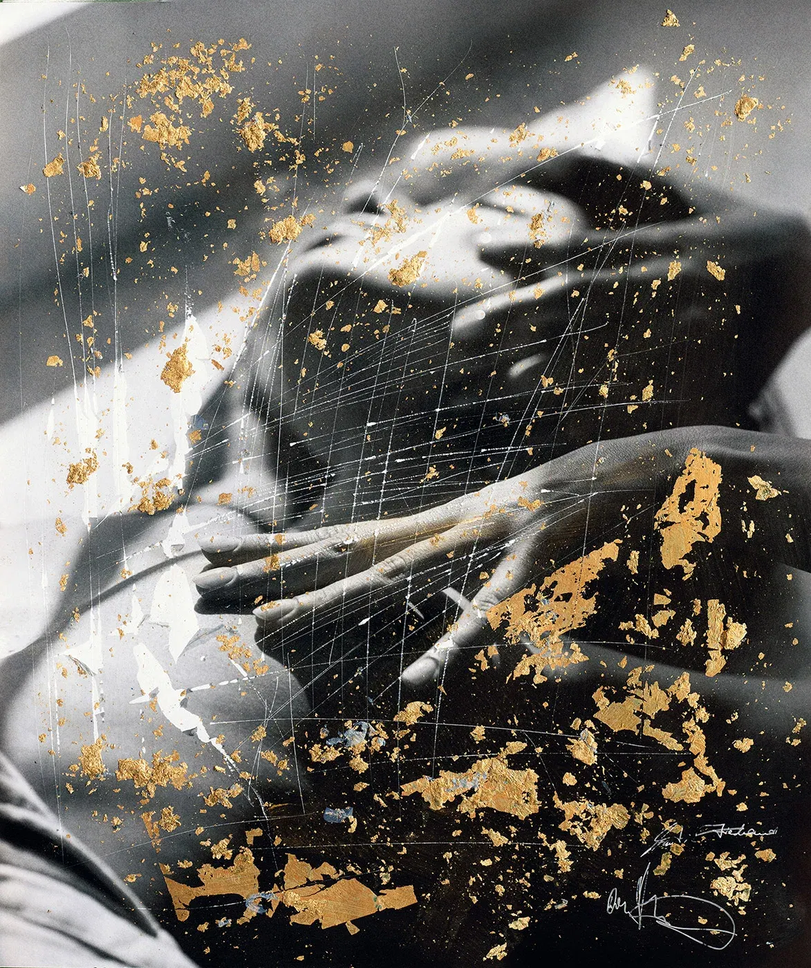 - Technique: touch-up pencil, gold leaf, scratches, original photograph, overpainting on Hahnemühle FineArt Baryta