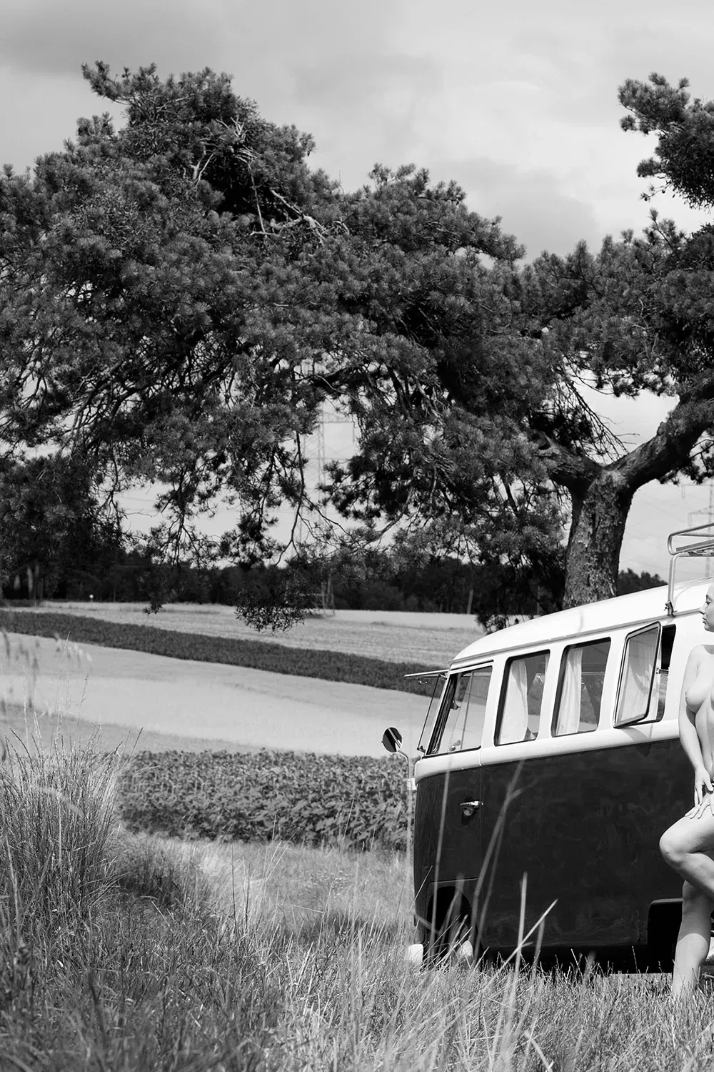 No destination, no obligations – just the road, an old van and an untamed lust for life. She leans against the bully as if it were her home, while the wind plays with her hair. The fields stretch endlessly, but what counts here is the moment. No city, no crowds, just nature and a woman who knows exactly what she wants. Erotic nude photography in black and white that tastes of freedom and looks like more.
