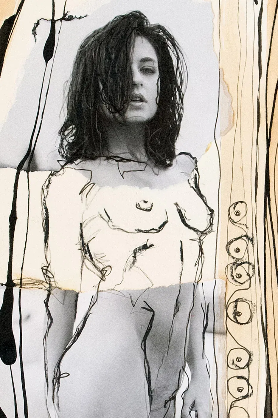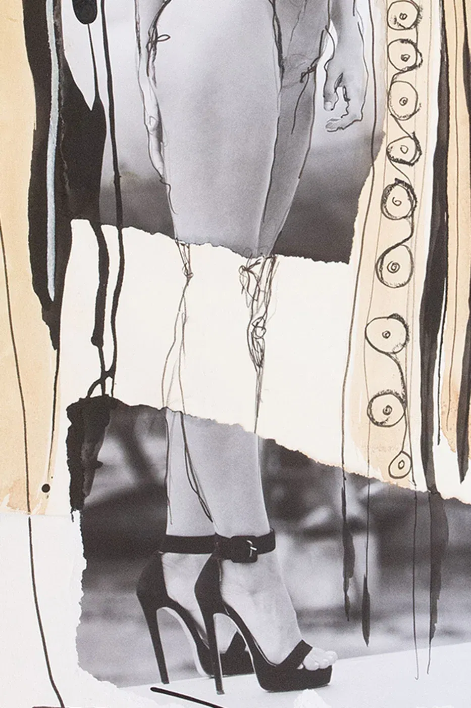 Sometimes the body speaks louder than any voice. Here she stands, between lines of ink and coffee stains, unimpressed by your presence. Her gaze slightly averted, her shoulders straight, her breasts marked like thoughts you can’t get rid of. Her legs end in high heels, as if she might march off at any moment. Contemporary collage art that creates maximum disquiet with minimal strokes. No answers. Only a quiet, painful echo that remains.