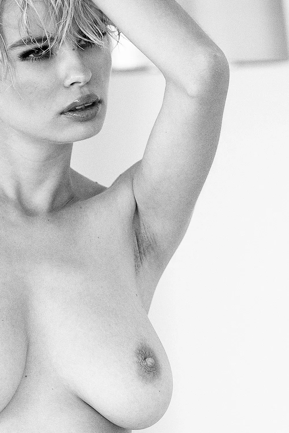 The sheet slowly slips lower, the hand remains firm. Erotic nude photography between defiance and devotion. The face tells stories that no one wants to hear. The night was too long, the morning too early – and yet this expression remains: a mixture of pride and exhaustion. She is there, very present, and at the same time already gone. The hair sticks to the forehead, the mouth says nothing, but the pose speaks volumes. Nothing is concealed here, nothing is smiled away.