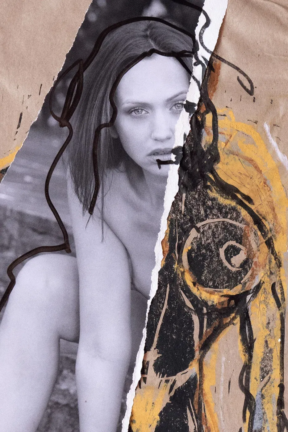 The skin still smells of past passion, the knees scratched by nights that you don’t want to remember, but which continue to burn beneath the surface. Contemporary collage art, as raw as the last drink at the bar. The lines are not random, they are drawn by life – wild, untamed, honest. Nothing is glossed over here, no filters, no excuses. Just bare skin, framed in chaos and desire. Art for those who feel life in the crash, who know that authenticity hurts and that is precisely why it tastes so sweet.