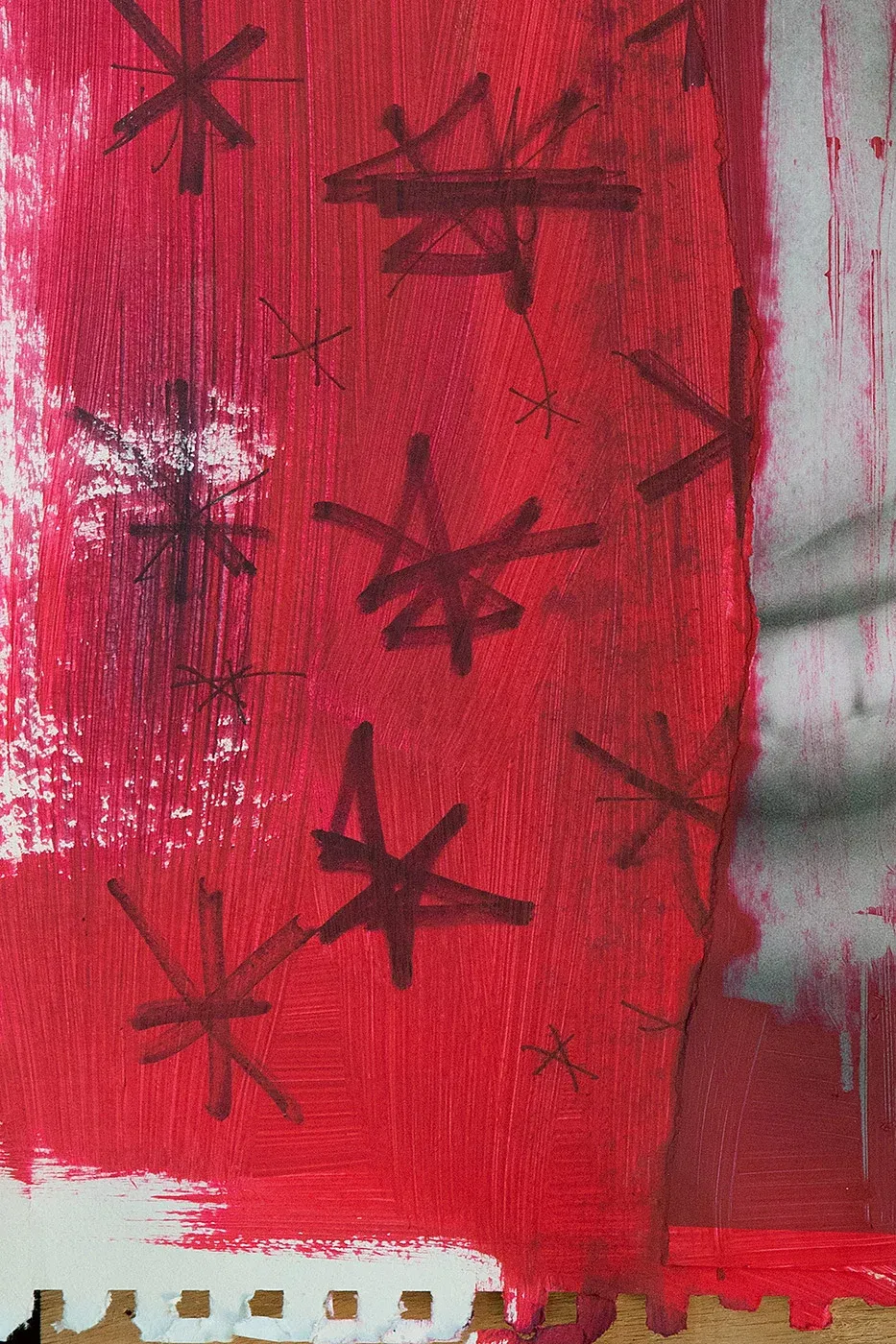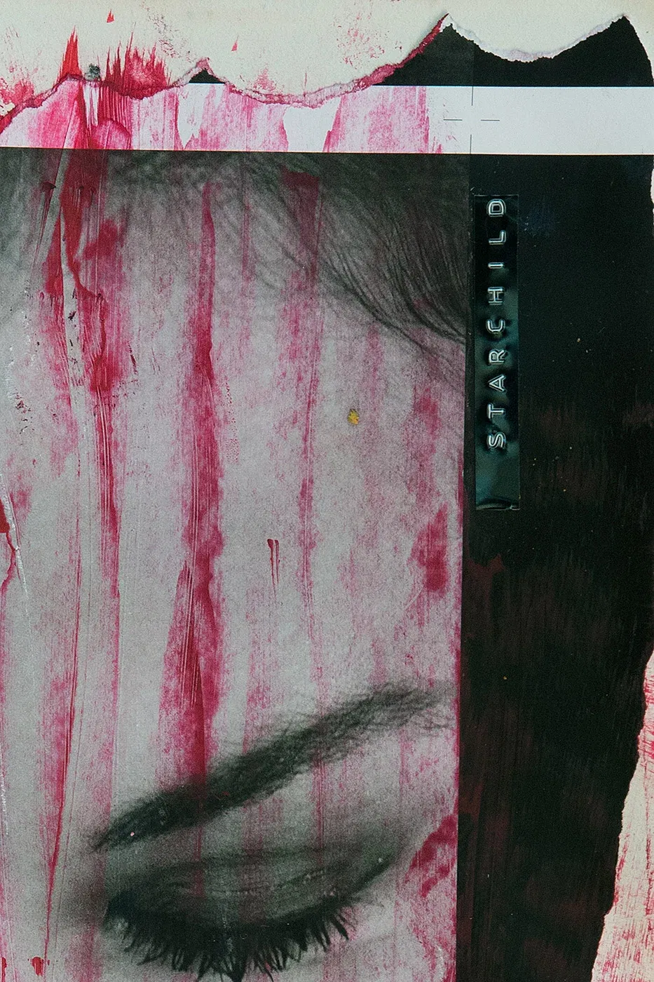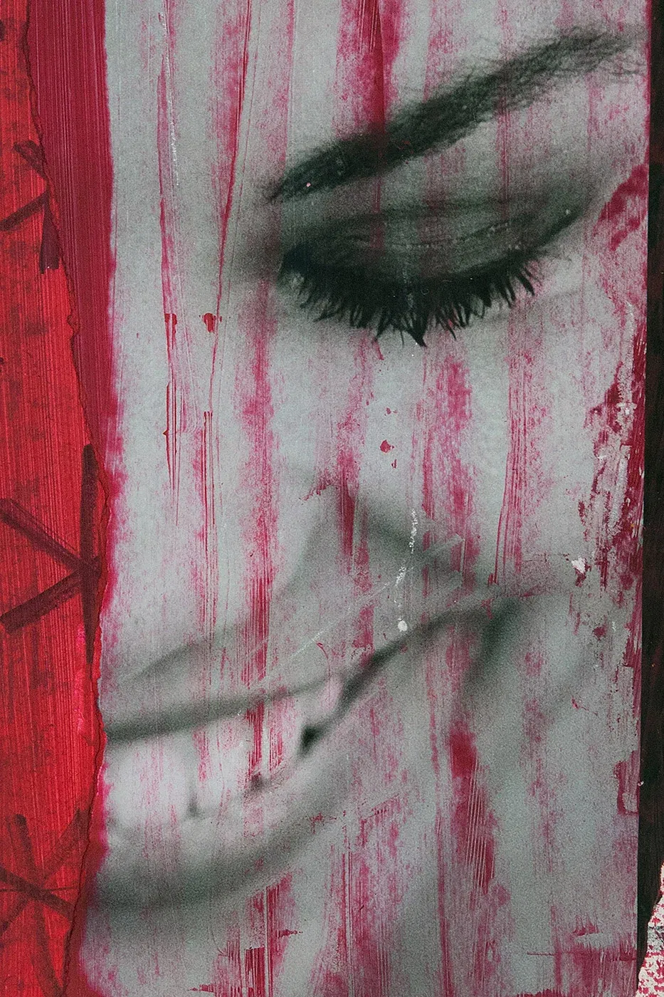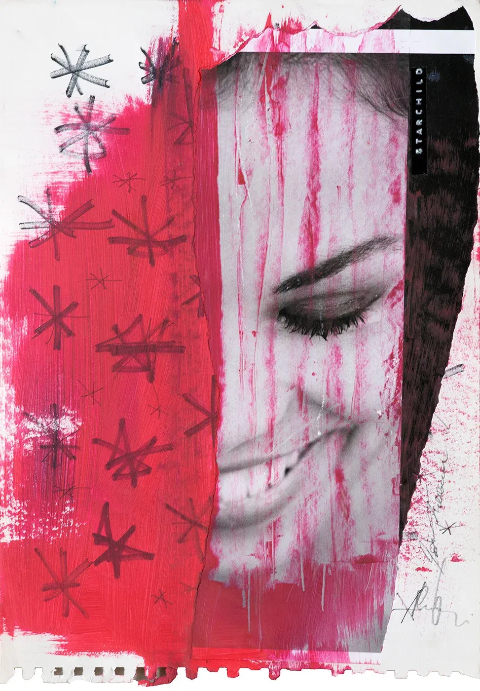 The red veil drips, but the smile remains. Ink scratches on paper while the memories continue to dance. 29.2 x 42 cm Contemporary collage art that makes no apologies. Acrylic, printed photography and a face that never quite disappears. Art that remains, even when the stars have long since fallen.
