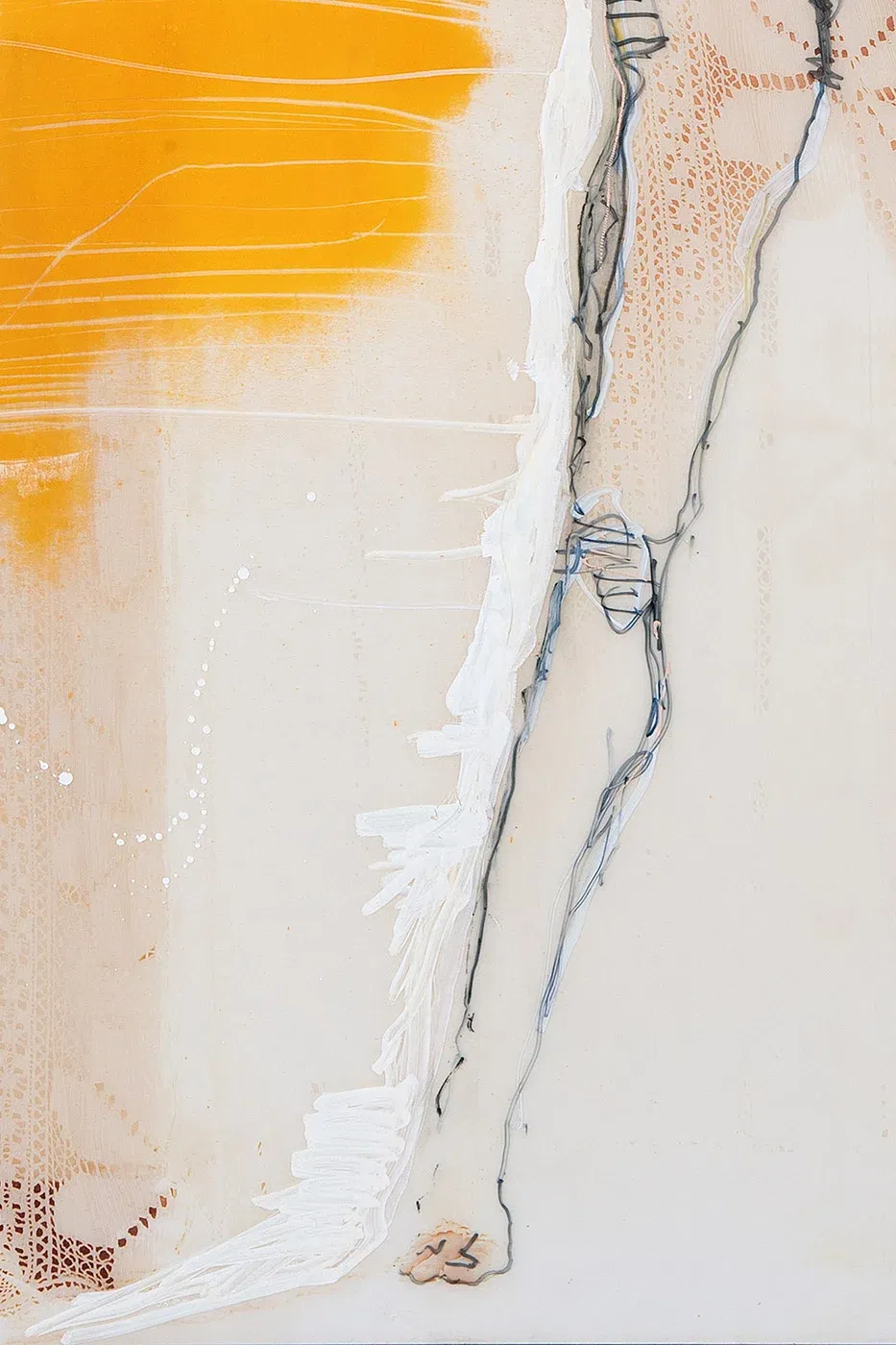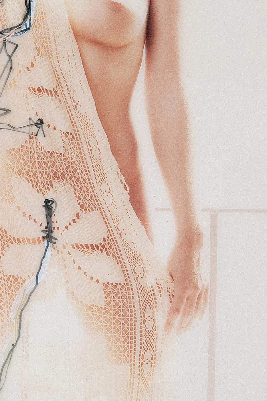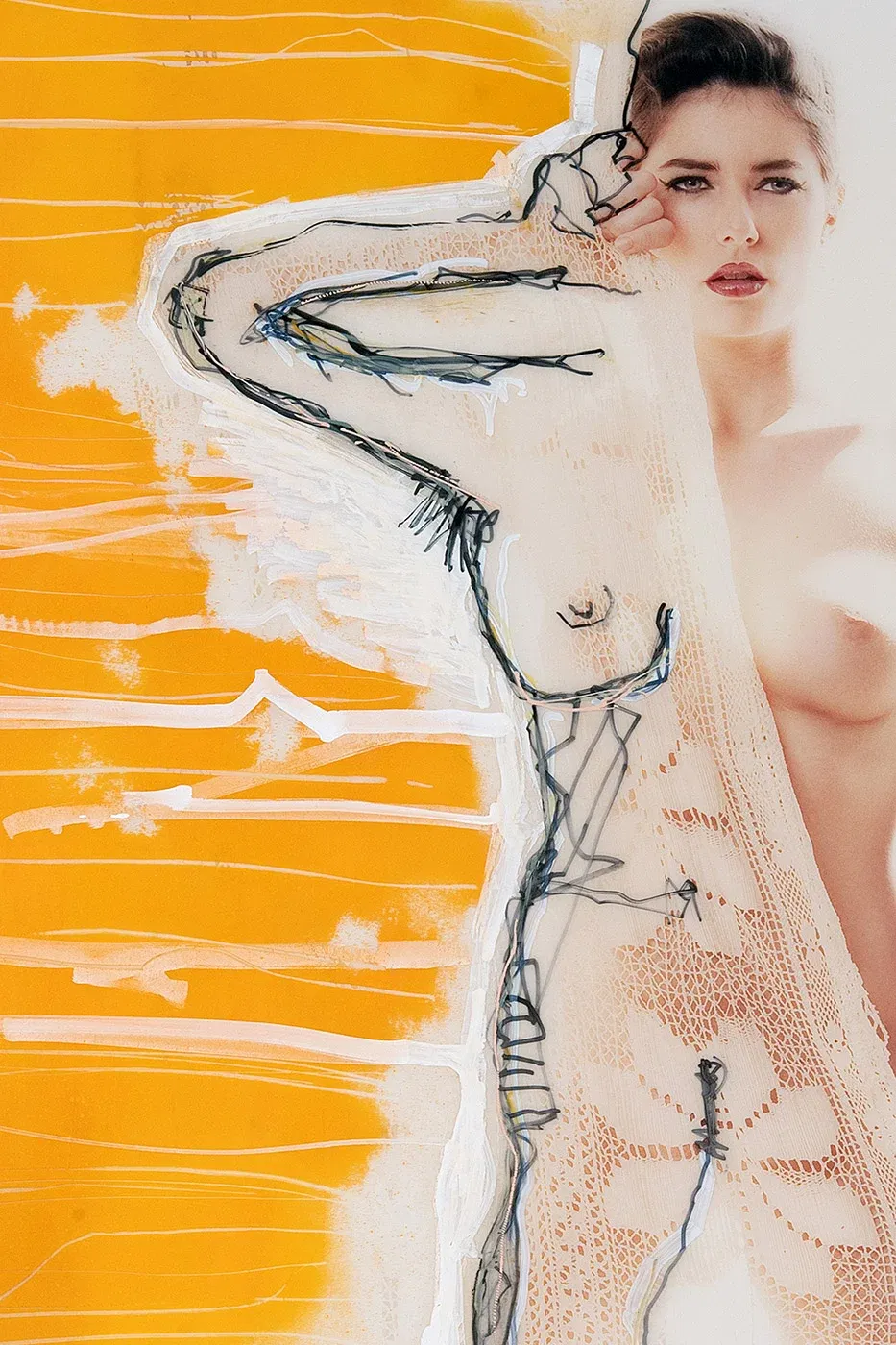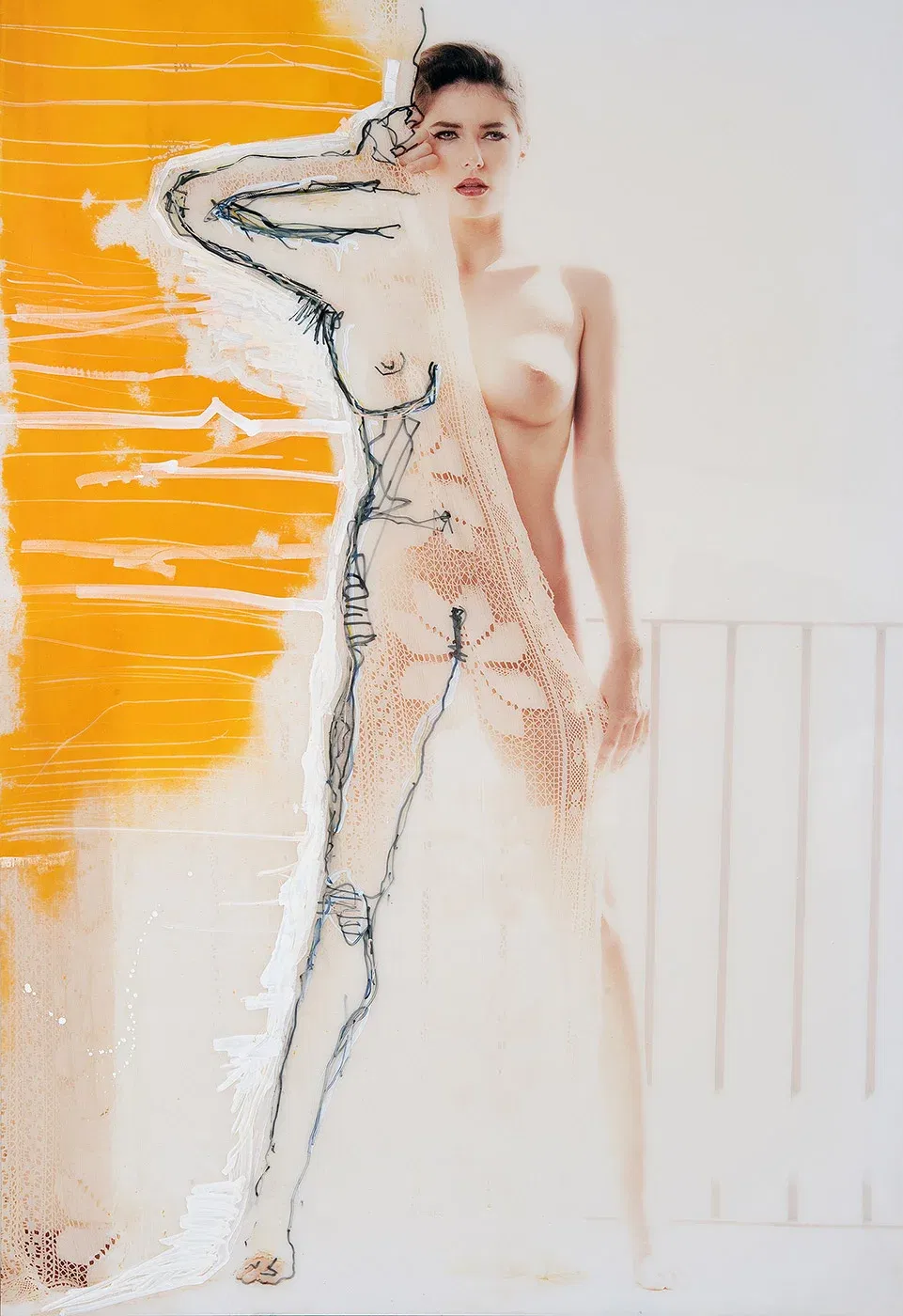 Contemporary collage art meets raw sensuality. Acrylic and photography merge in a 100×150 cm unique piece.