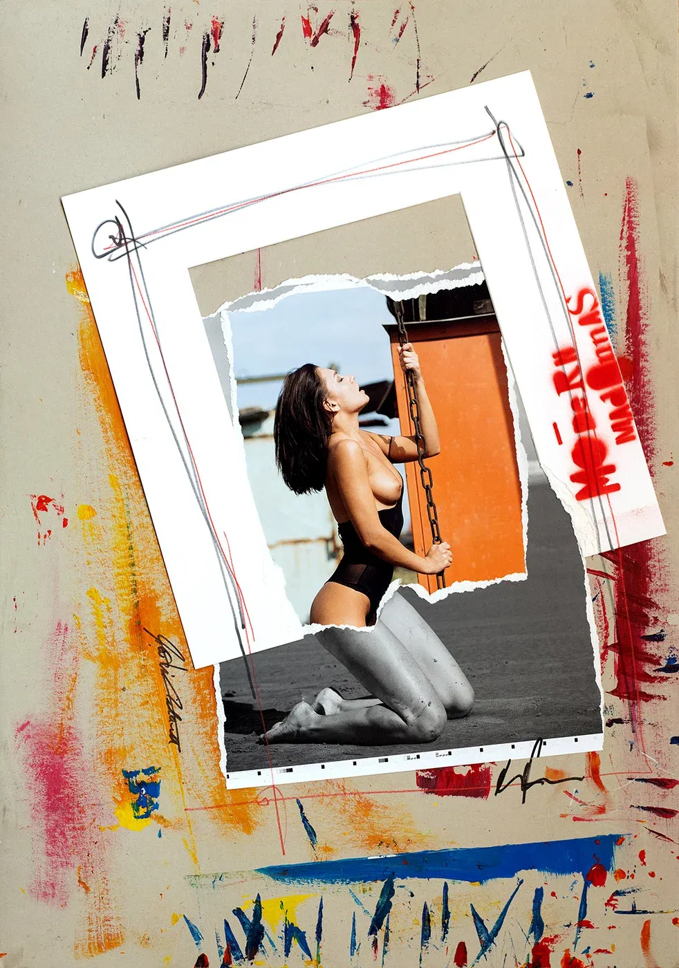 This is not about one woman. It’s about two. Two bodies, two stories, two fates that never touch and yet are inextricably linked. One in color, tangible, chained to reality – the face of the present, the skin warm from the sunlight. The other? A shadow, a fragment that flickers between the white edges, like a memory you can’t let go of. The necklace is not jewelry, it is a promise. A silent symbol of power, control, devotion. Contemporary collage art that turns you into a voyeur, a player in a story that knows no heroes. There are no questions here, no answers – just you, the two women and the necklace that connects everything.