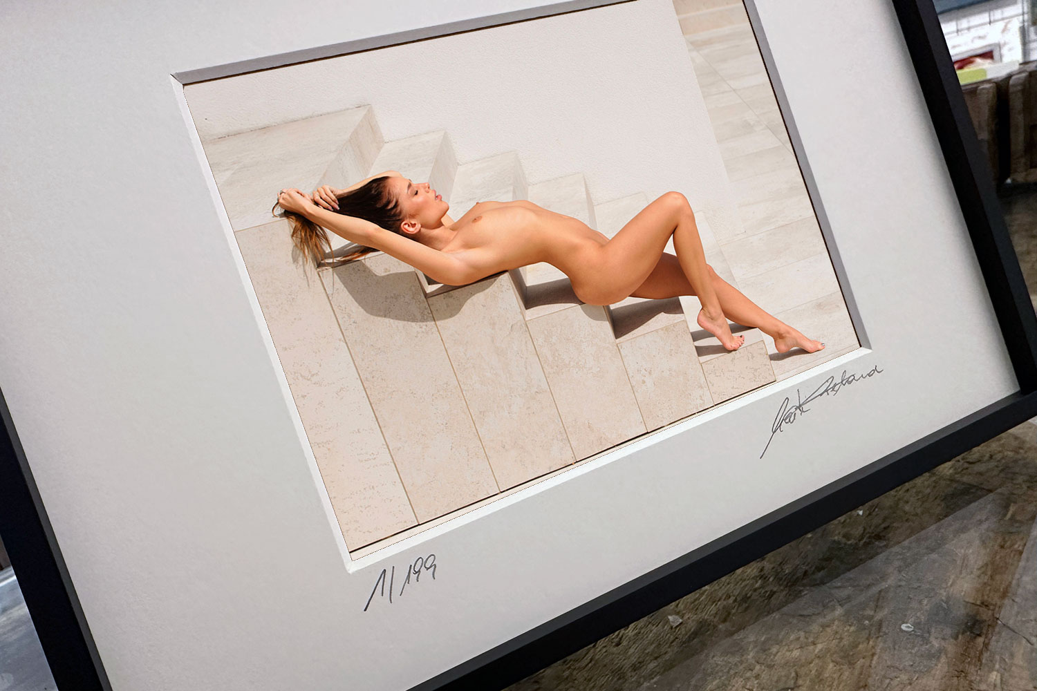 “Use Stairs at Your Own Risk” – framed print presented on a table – limited fine art nude photography