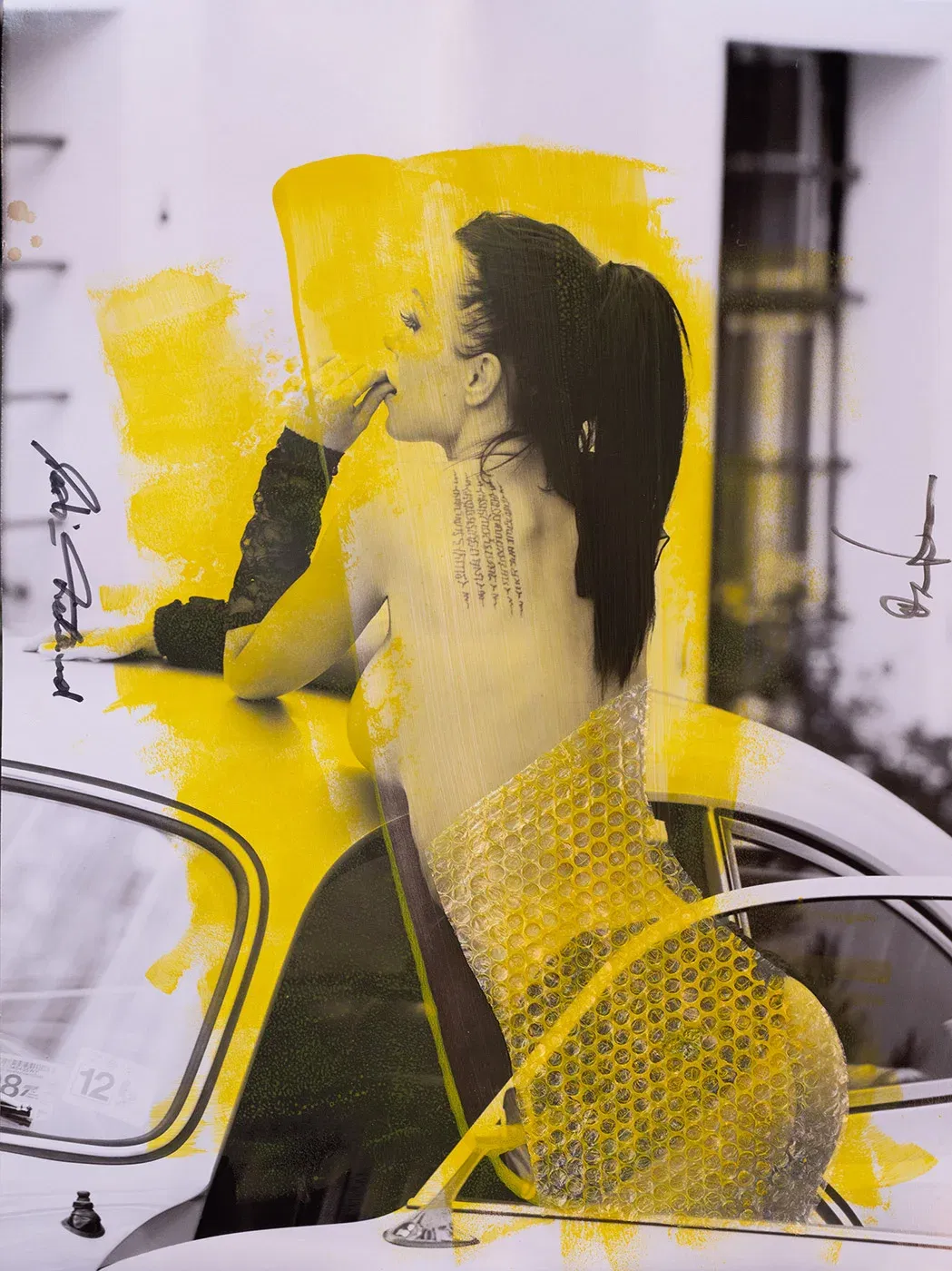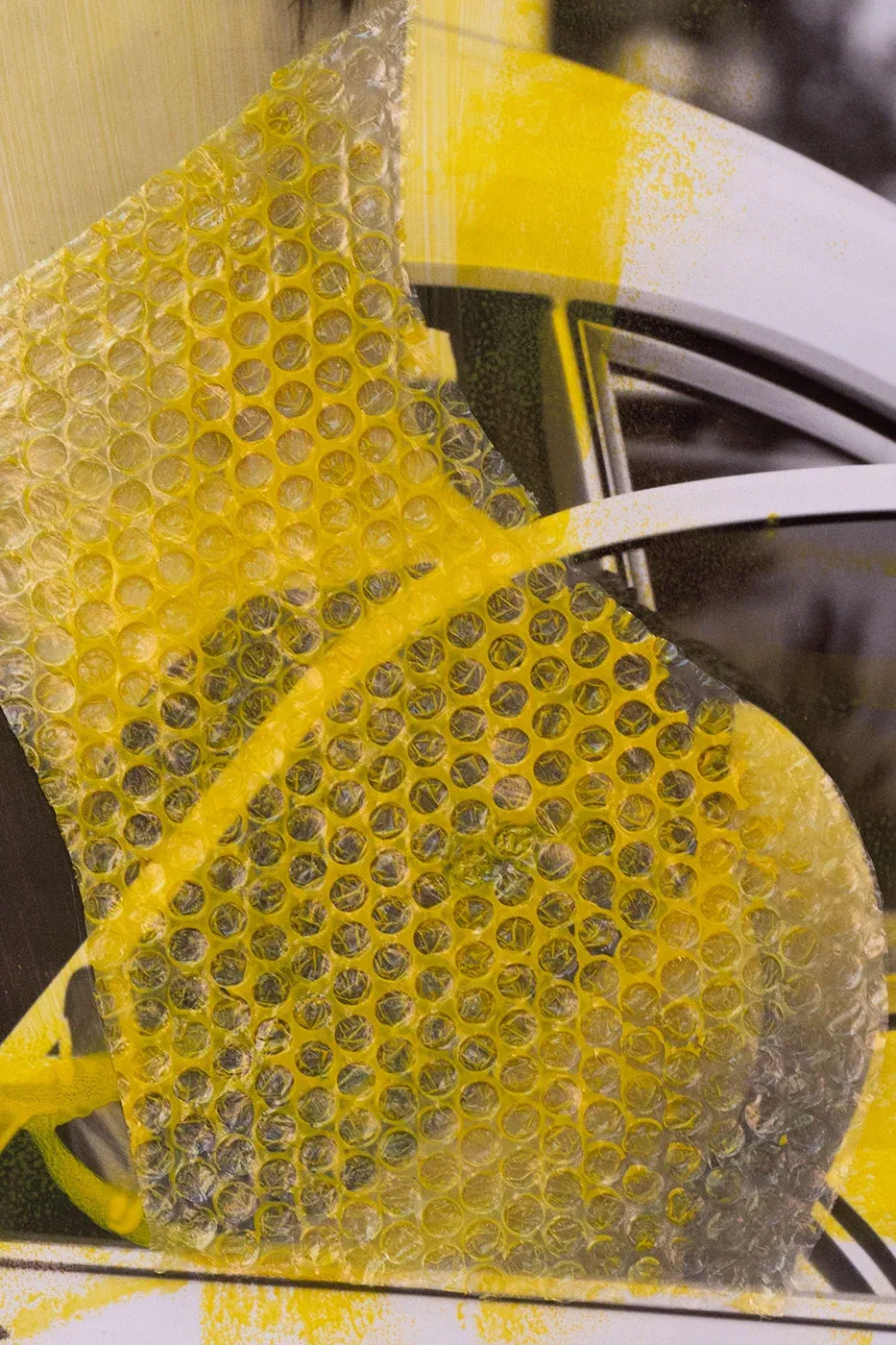 Wrapped – A contemporary collage artwork combining neon yellow with fine art photography and bubble wrap. Already framed with exclusive museum glass.