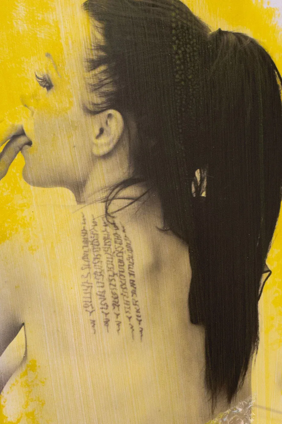 Zeitgenössische Collagenkunst – “Wrapped” bringt den Neon-Schockfaktor ins Spiel und hinterlässt einen bleibenden Eindruck. Dieses beeindruckende Werk der Modern Madonna-Serie nutzt knallige gelbe Akzente über einer Schwarz-Weiß-Fotografie, um ein visuelles Statement zu setzen. Die Luftpolsterfolie, die sich wie eine zweite Haut um den Rücken legt, verbindet Ironie mit High-Fashion-Elementen und erzeugt den Eindruck einer modernen Rüstung. Das Werk wirkt wie eine paradoxe Verschmelzung von Verletzlichkeit und Selbstschutz. Es ist, als würde es sagen: “Ich bin offen und verletzlich, aber du siehst nur, was ich dich sehen lasse.”