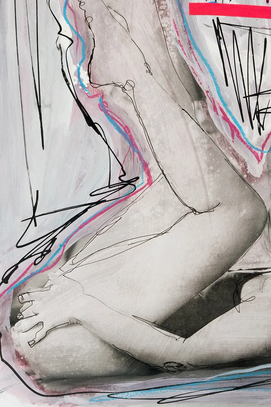 Contemporary collage art on FineArt Baryta photo paper. 50 x 70 cm, touch-up pencil, ink and oil pastel – raw and honest.