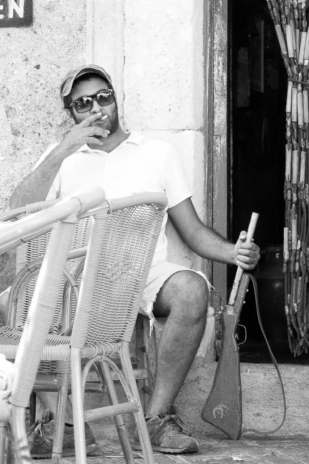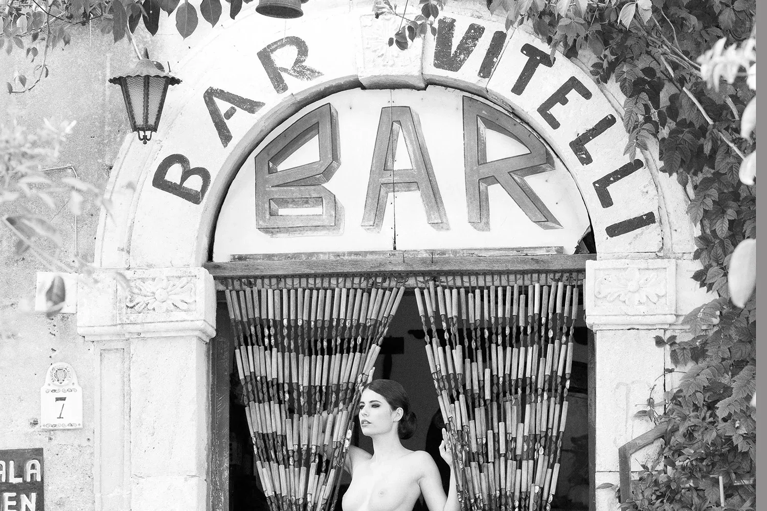 Bar Vitelli – eine Legende, ein Schauplatz für Filmgeschichte. Doch das hier? Das ist verdammte Realität. Sie tritt durch die Bambusvorhänge wie ein Engel ohne Heiligenschein, nackt, stolz, als wäre sie schon immer Teil dieser Geschichte gewesen. Der Typ mit der Zigarette starrt, als hätte er einen Geist gesehen. Aber sie ist echt, und das macht dieses Bild zu etwas Größerem. Erotische Aktfotografie mit Filmgeschichte im Hintergrund – und einer verdammt guten Hauptrolle.
