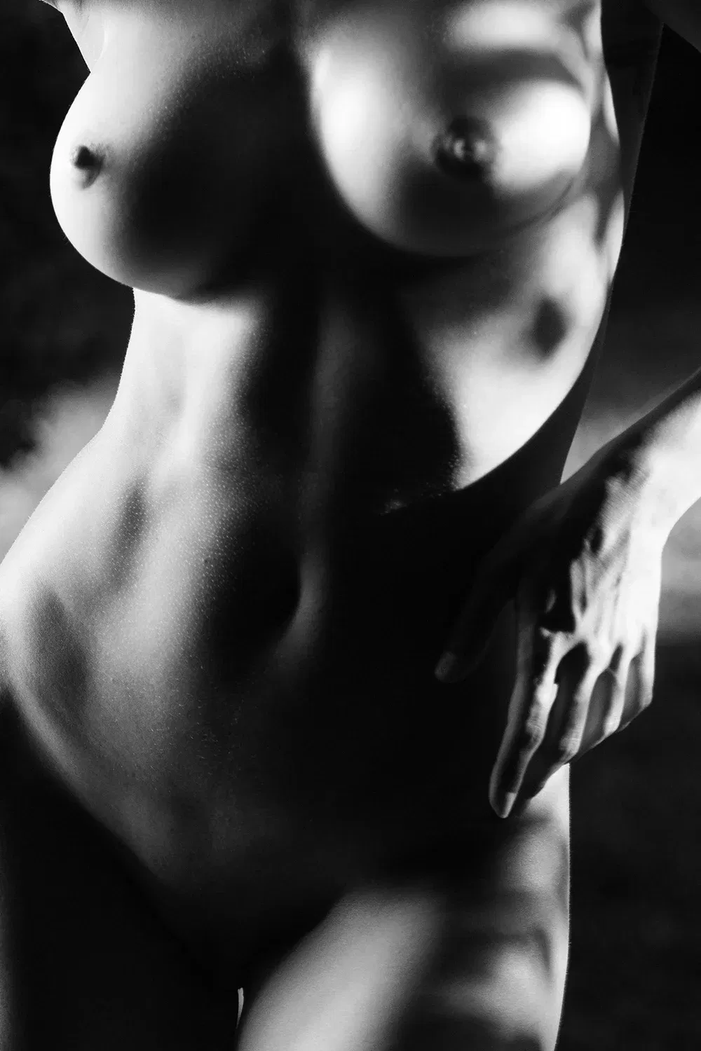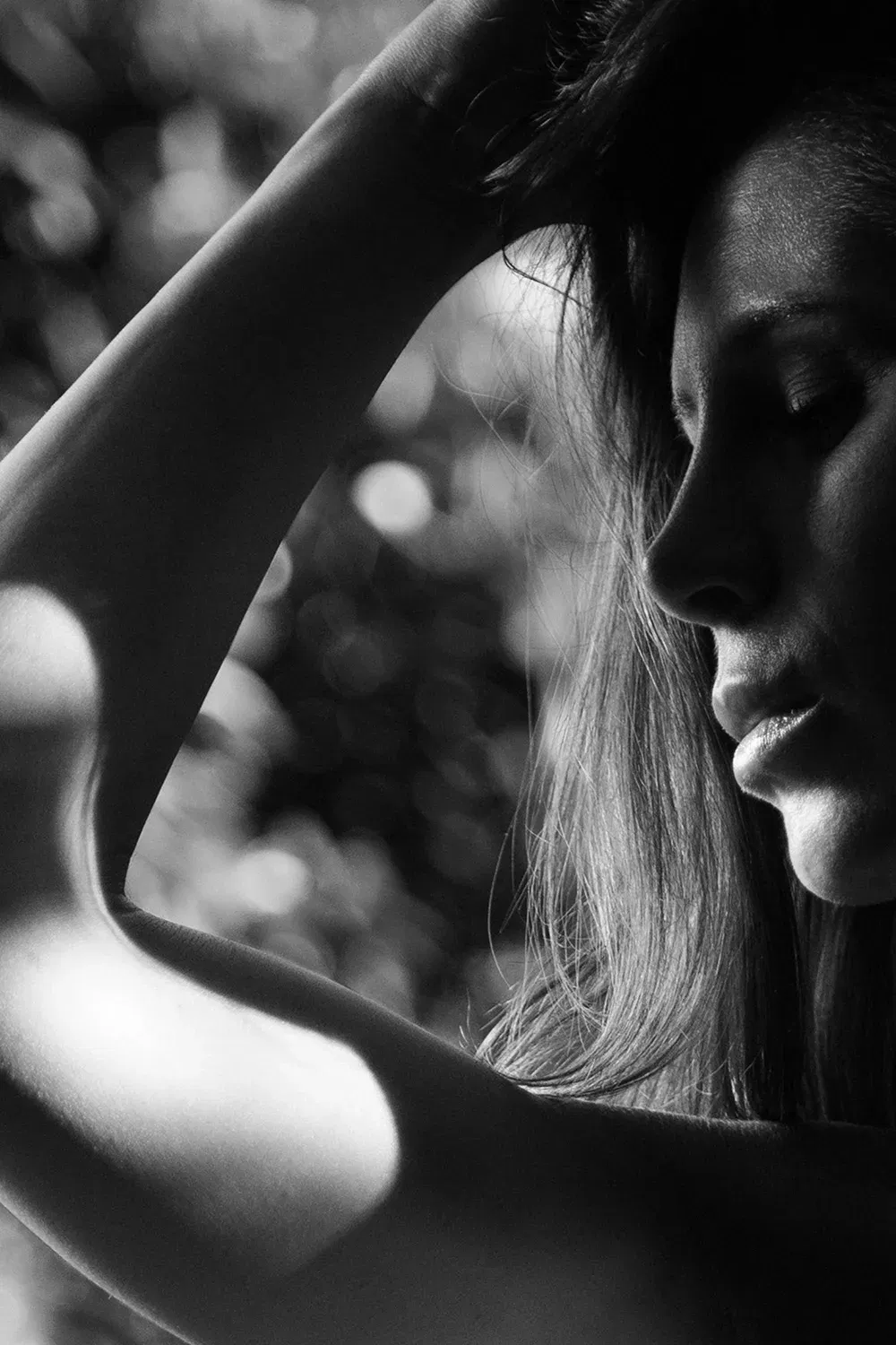 Licht und Schatten spielen auf ihrer Haut, ein Moment voller Intensität. Erotische Aktfotografie in purer, ungeschönter Ästhetik.