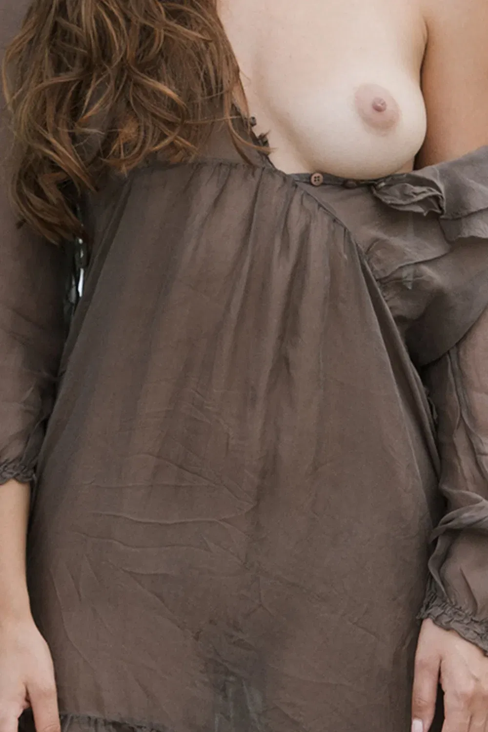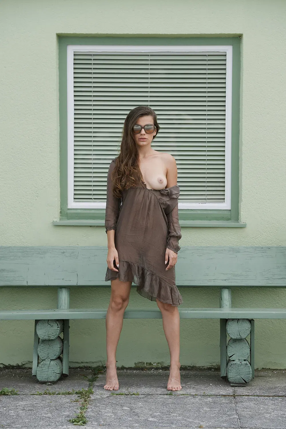 Die Sonnenbrille ist nicht für die Sonne. Sie ist für dich. Ein Schutzschild, ein Statement, ein “Fick dich”. Das Kleid hängt schief, die Welt steht still. Erotische Aktfotografie in ihrer ehrlichsten Form – ein Bild, das dich fixiert, ohne sich zu entschuldigen.