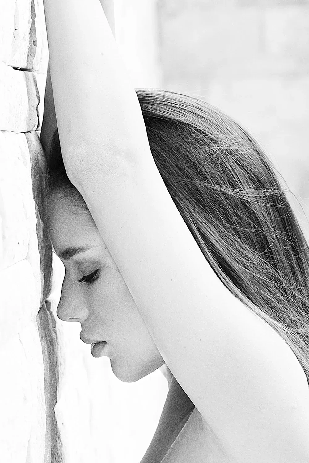 Ihre Fingerspitzen tasten über den Stein, als würde sie nach etwas suchen, das nicht da ist. Ihr Körper drückt sich an die Wand, ihr Atem geht flach. Sie hält sich fest, oder hält sie etwas anderes fest? Die schwarzen Träger schneiden sich in ihre Haut, während die Sonne Schatten auf sie malt. Erotische Aktfotografie mit rauen Kontrasten – weich, hart, kompromisslos.