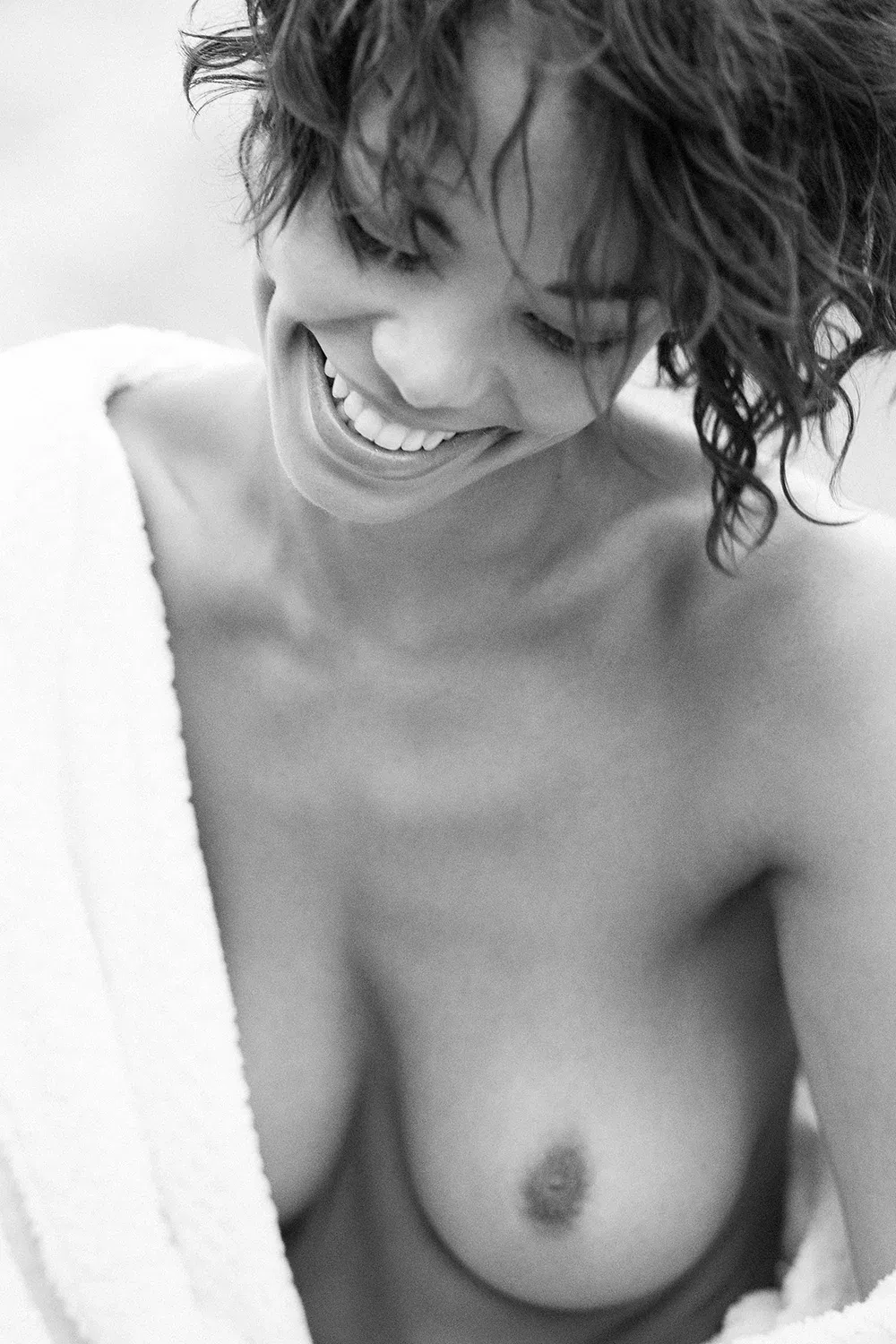 Sie lacht, als gäbe es nichts Schöneres, und vielleicht hat sie recht. Ihr Gesicht erzählt Geschichten, ihr Blick bleibt irgendwo zwischen unschuldig und wissend. Ein Bild, das nichts will außer existieren – genau wie sie. Erotische Aktfotografie, die so leicht ist wie ein Sommertag und doch für immer bleibt.