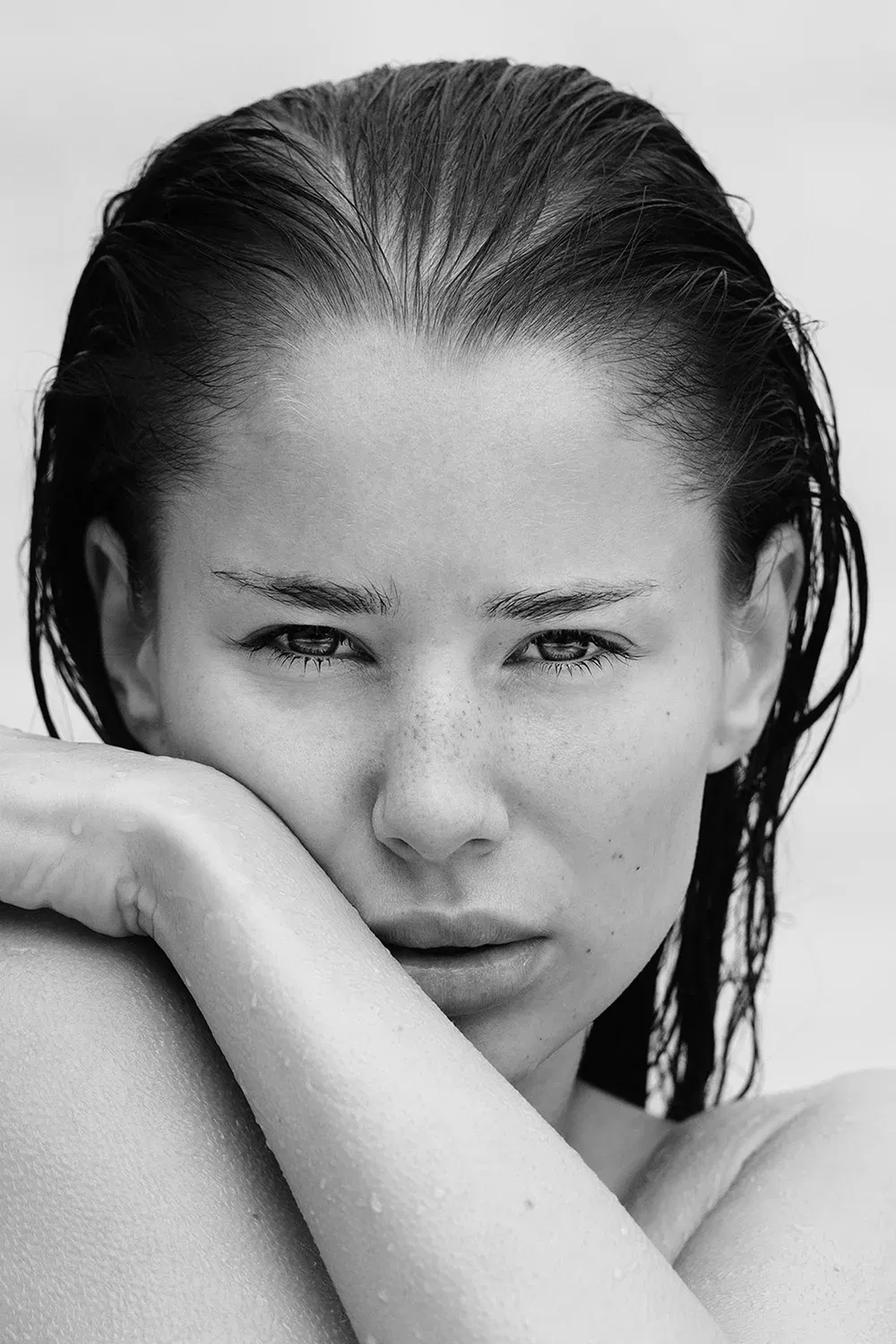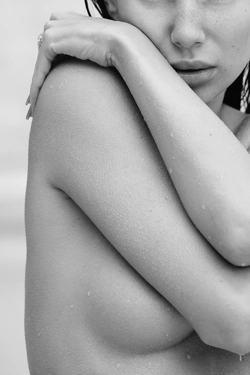Erotische Aktfotografie, die dir den Boden unter den Füßen wegreißt. Sie steht da, nackt, nass, mit einem Blick, der sagt: “Komm her – und dann bereu es.” Die Haut ist gesprenkelt mit Wassertropfen, die sich an ihr festklammern wie an einer letzten Hoffnung. Die Arme verschränkt, nicht zum Schutz, sondern zur Provokation. Das hier ist kein zartes Spiel. Das ist der Moment, in dem du realisierst, dass Unschuld nur eine billige Lüge ist. Wer hier von Schönheit spricht, hat die Botschaft nicht verstanden. Das ist Härte in Reinform. Erotik, die kein Ja braucht, um zu existieren.