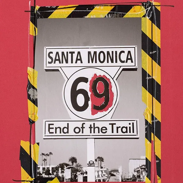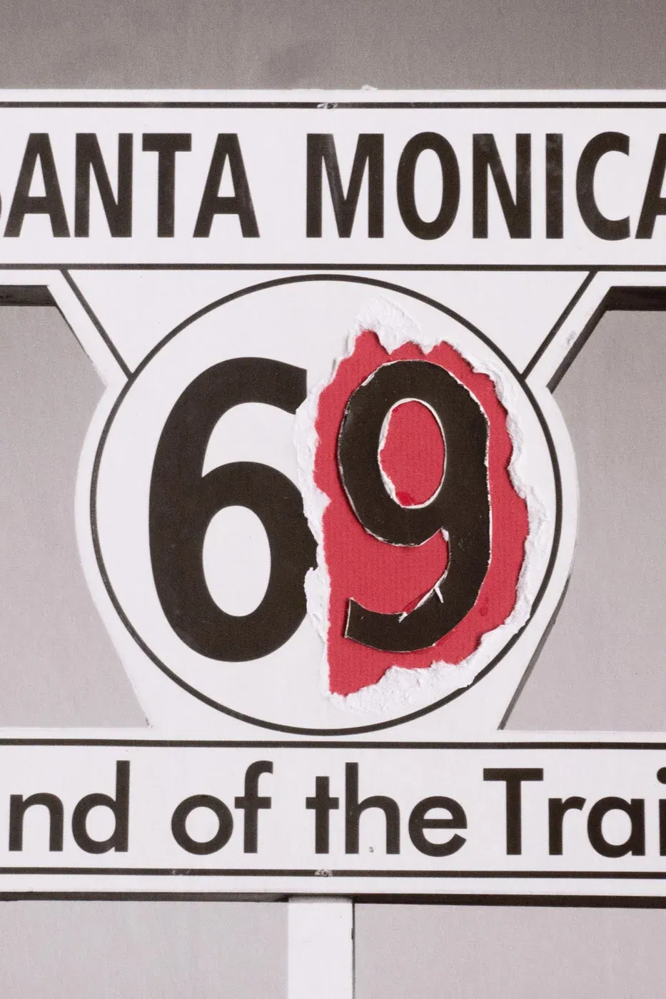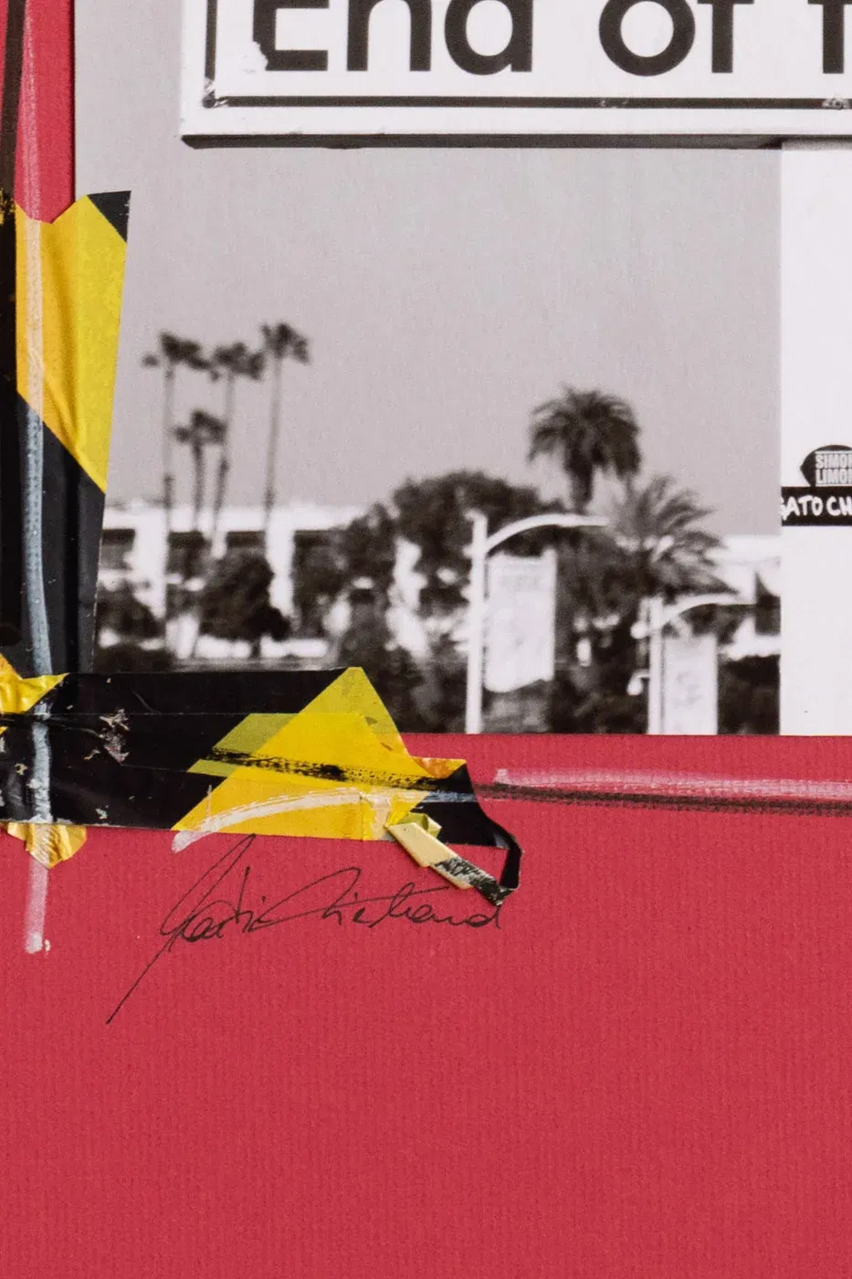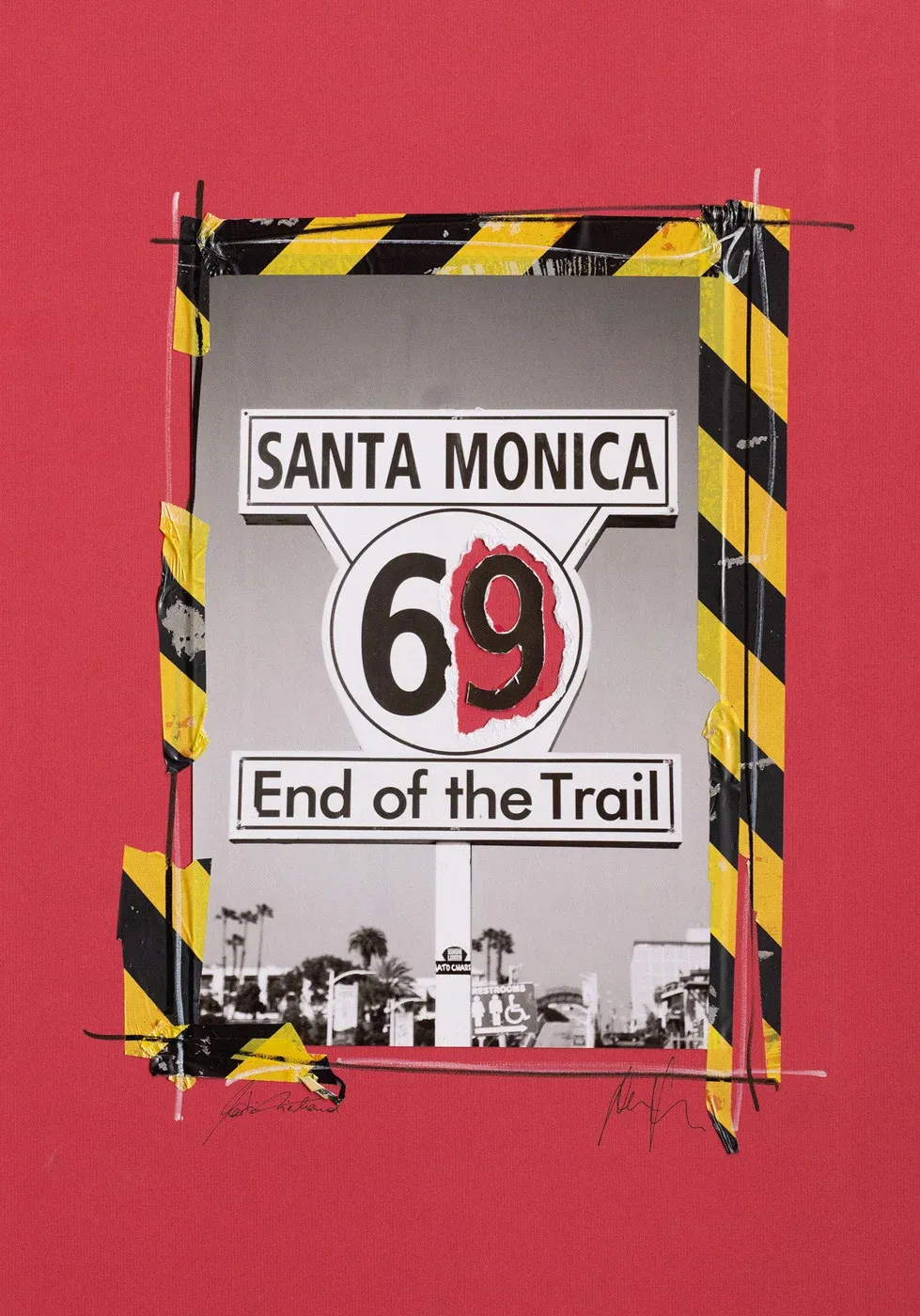 Ein Straßenschild, ein Symbol, eine Endstation. Santa Monica – End of the Trail. Doch diese Arbeit bleibt nicht beim bekannten Bild. Das 69 in leuchtendem Rot durchbricht die Norm, eingerahmt von Klebeband, das wirkt, als halte es die Erinnerung zusammen. Moderne Landschaftskunst, die die amerikanische Straßenromantik entmystifiziert. Hier geht es nicht um Nostalgie, sondern um die Frage, was bleibt, wenn der Weg zu Ende ist.
