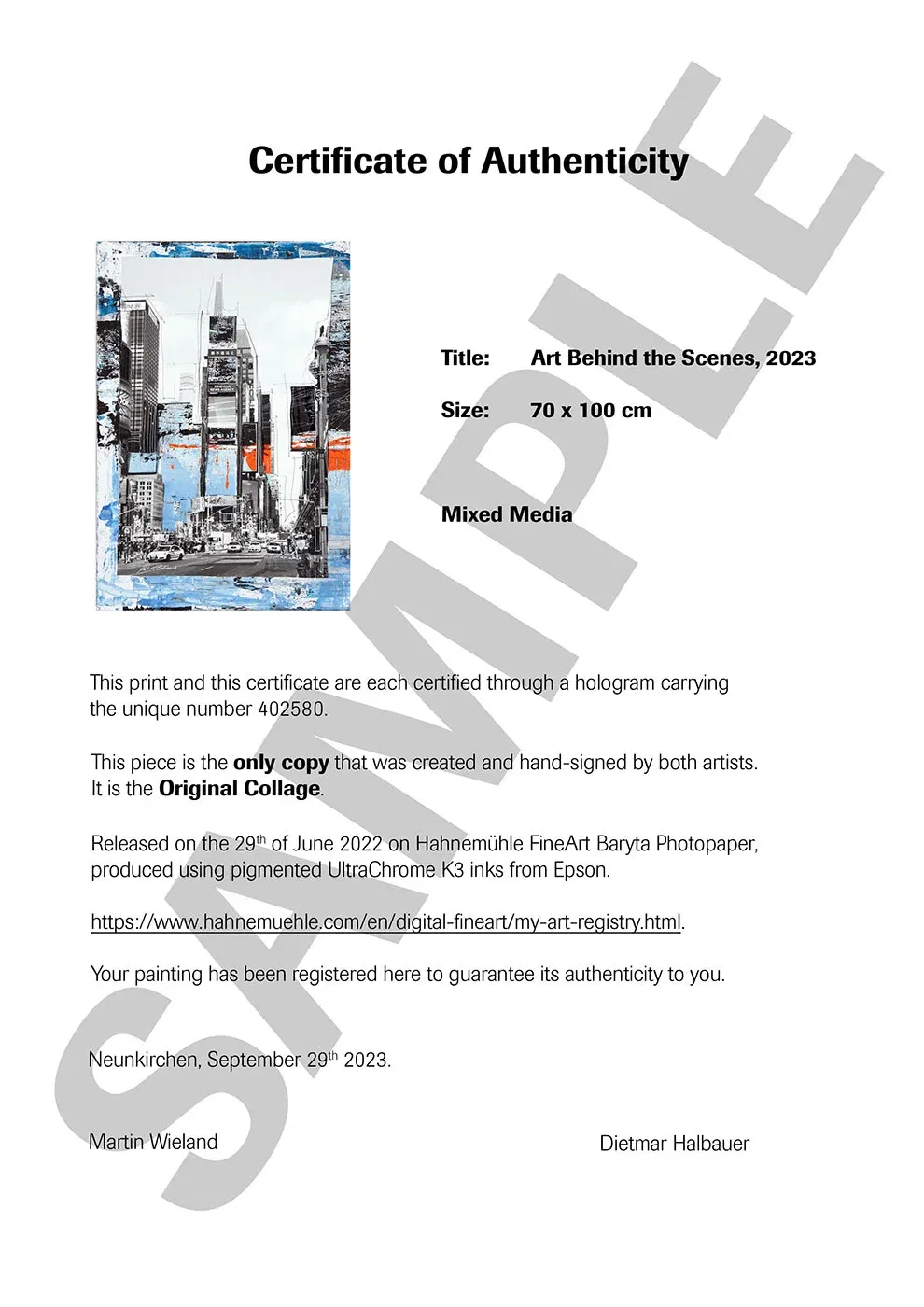 Mit dem mitgelieferten Echtheitszertifikat wird die Authentizität dokumentiert und der Wert des Kunstwerks nachhaltig gesichert.