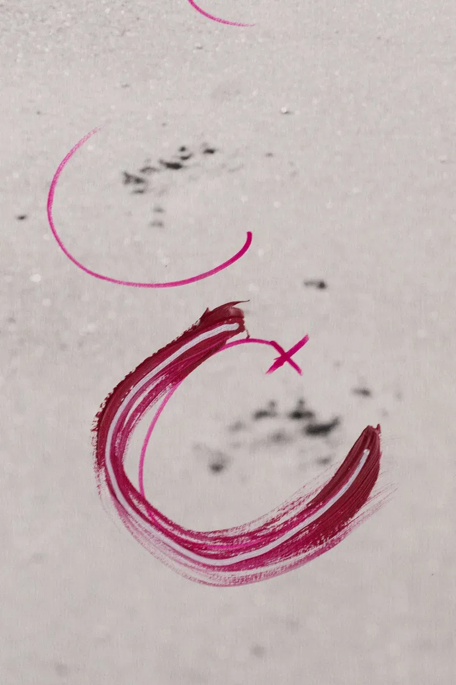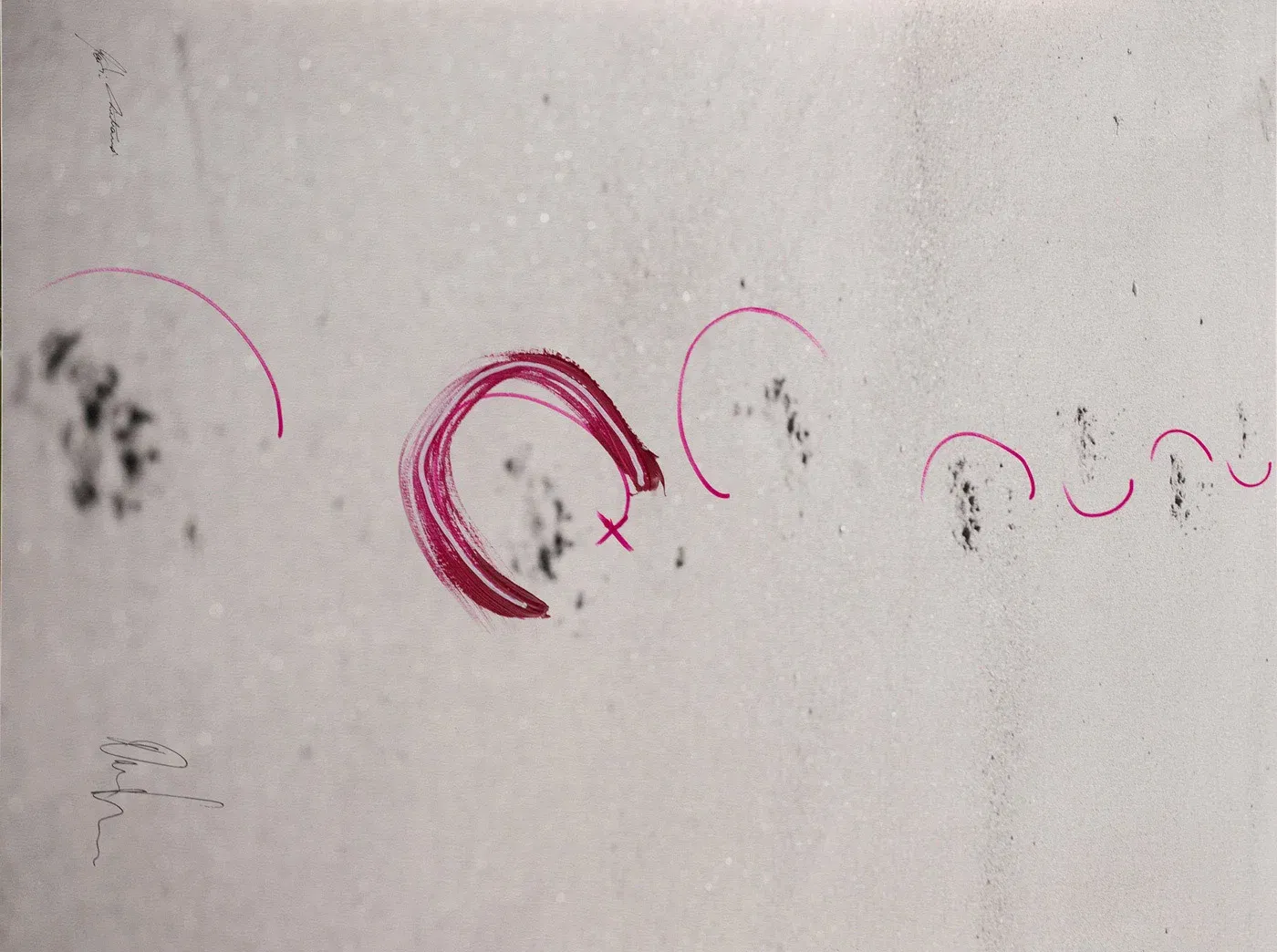 Manchmal hinterlassen wir Spuren, ohne es zu merken. Der Sand erinnert sich – an jeden Schritt, an jede Bewegung. In dieser modernen Landschaftskunst wird das sichtbar: dunkle Abdrücke, pinke Bögen, ein Tanz zwischen Vergänglichkeit und Beständigkeit. Acryl und Lackstift auf feinem Baryta-Papier zeigen, wie flüchtig und gleichzeitig hartnäckig unsere Spuren sind. Ein Moment, eingefroren im Spiel von Form und Fläche.