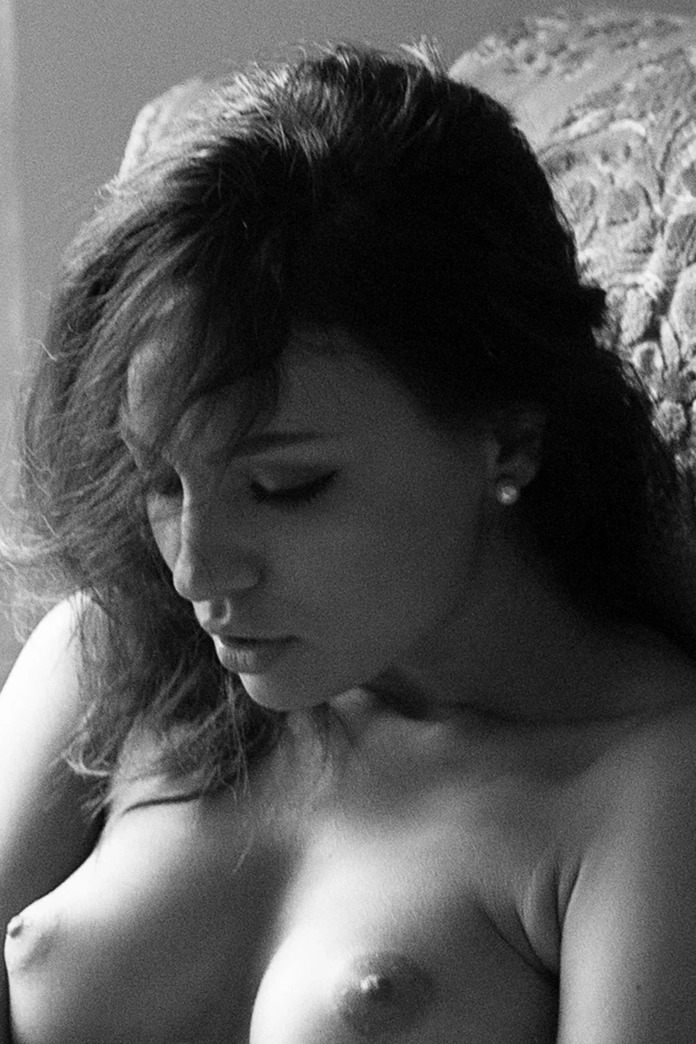 Moderne Aktfotografie, die die Harmonie von Licht und Schatten in einem Moment der Intimität und Reflexion einfängt.