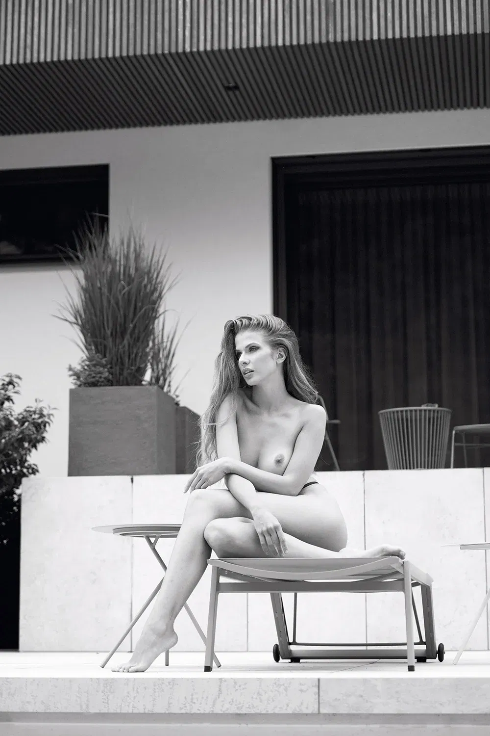 Die zeitgenössische Aktfotografie „Take Me to the Water“ fängt den Moment purer Ruhe ein. Nur mit ihrem Selbstbewusstsein und einem Hauch von Sonne bekleidet, genießt die Frau die Stille am Pool. In dieser minimalistischen Szene gibt es keine Eile, keine Sorgen – nur sie, der Stuhl und ein Hauch von Luxus in einer Welt, die für einen Moment stillsteht. Der Moment ist so einfach wie erfrischend, und doch trägt er eine tiefere Bedeutung: die Freiheit, einfach zu sein.