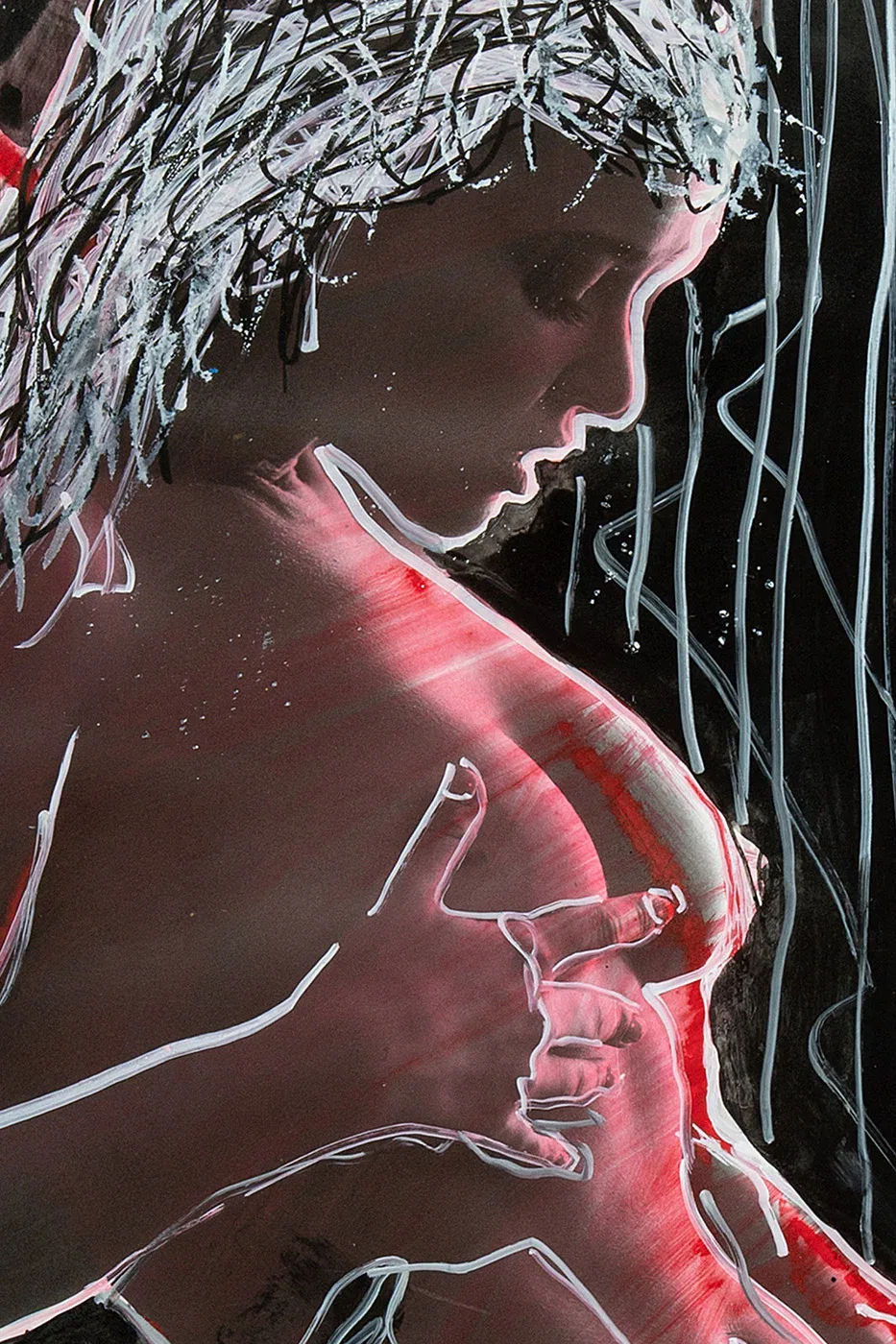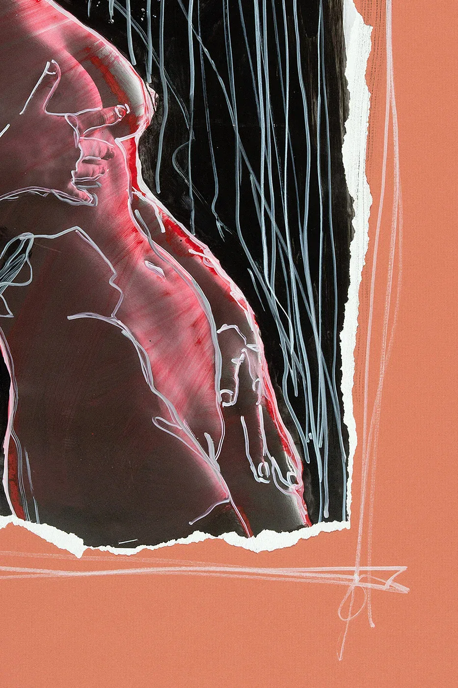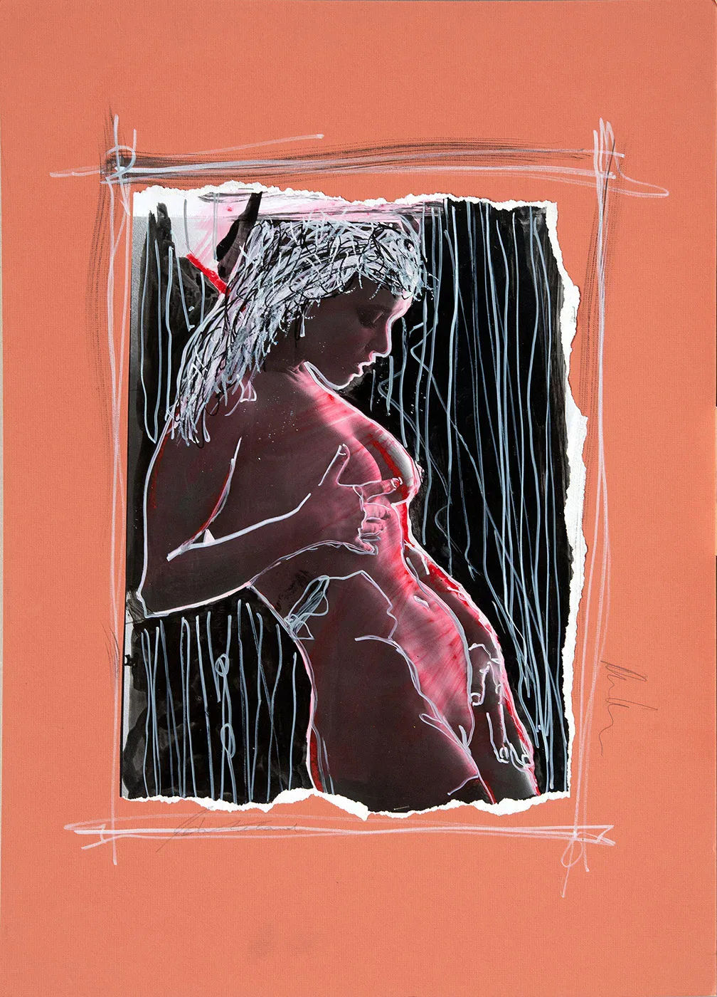 Der Körper ist da, aber der Geist hängt irgendwo da draußen. Die Linien schneiden sich wie Fäden durch den Raum, ziehen an ihr, halten sie fest. Zeitgenössische Collagenkunst, die keine Gnade kennt. Der Hintergrund bleibt dunkel, der Kontrast brutal. Der Lackstift krallt sich ins Karton, das Aquarell fließt wie alte Gedanken, die man nicht loswird. Der Blick ist nach innen gerichtet, als würde sie einer Erinnerung hinterherjagen, die längst verschwunden ist. Es gibt keine Erklärungen hier. Nur Haut, Licht und Farbe, die sich wie Narben in die Oberfläche eingraben. Dieses Bild ist nicht freundlich. Es ist ehrlich. Und das reicht.
