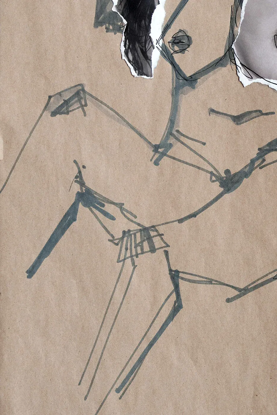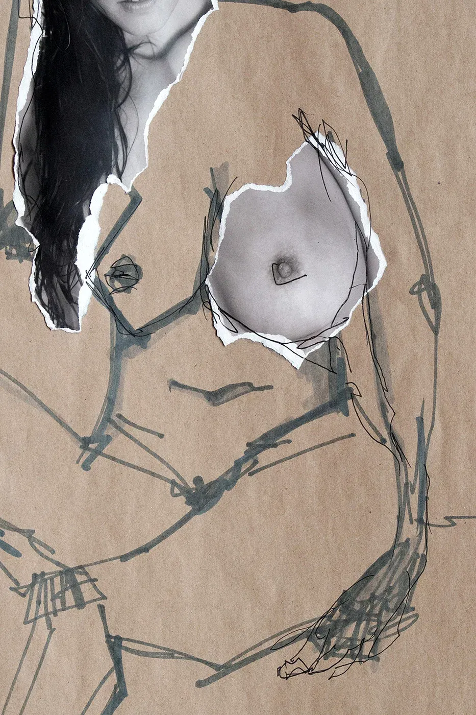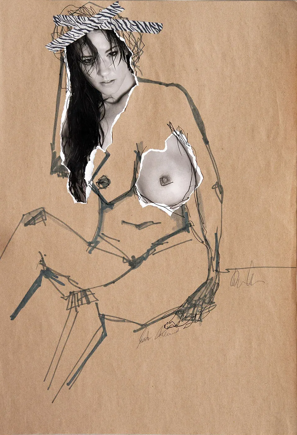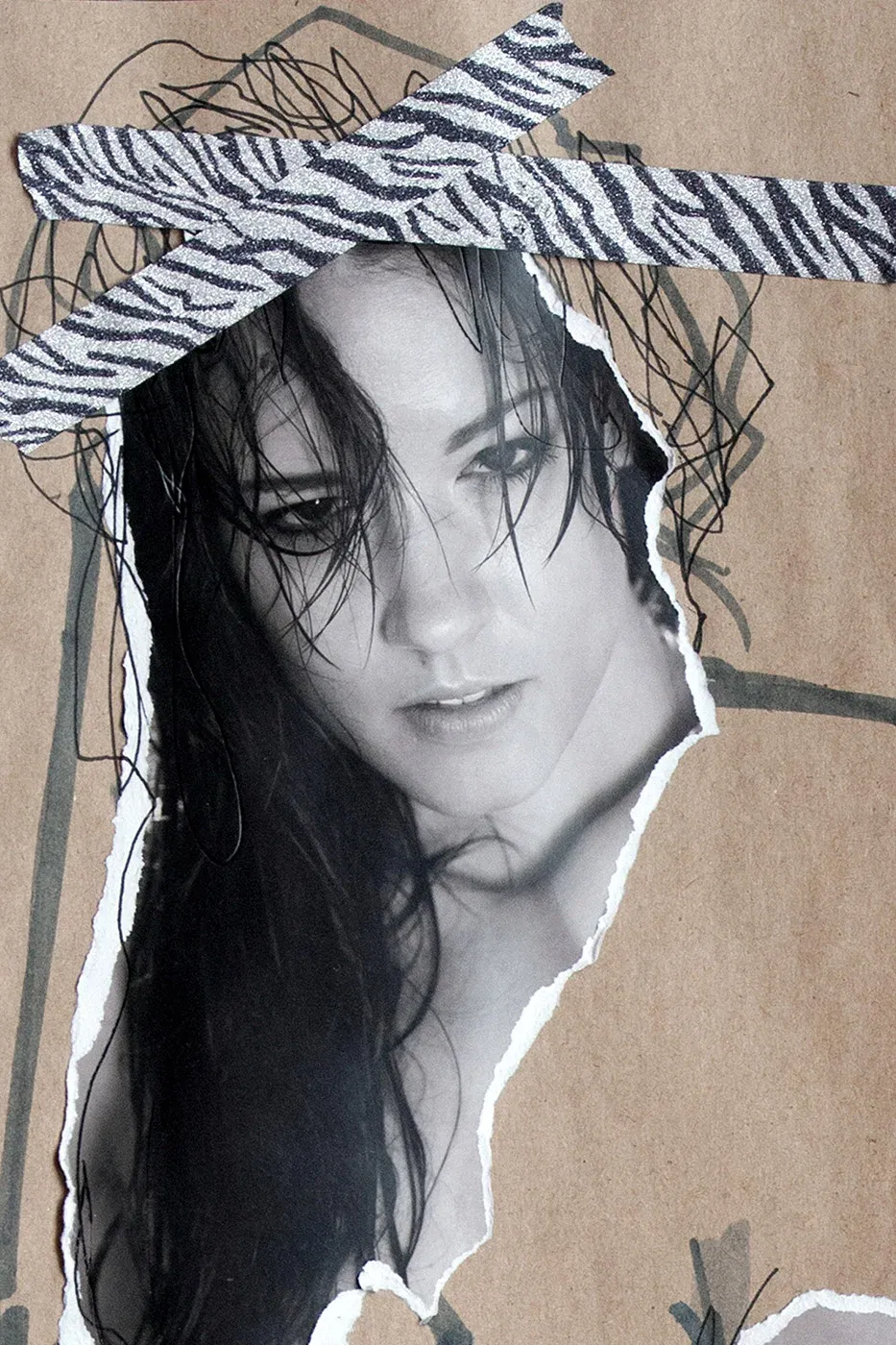 Braunes Papier, rau und natürlich. Die Tusche zieht Spuren wie Gedanken, die nicht loslassen. Der Körper – nur angedeutet, zerrissen und wieder zusammengeklebt. Das Gesicht, eingefügt wie eine Erinnerung an etwas Echtes. Die Haare nass, der Blick müde, aber lebendig. Hier gibt es keine glatten Flächen, keine harmonischen Formen. Zeitgenössische Collagenkunst, die lebt, indem sie sich wehrt. Das Klebeband im Haar wirkt wie eine Krone für eine Königin, die längst abgedankt hat. Und genau deshalb funktioniert es. Kunst braucht keinen Glanz, sondern Mut zur Unvollkommenheit.