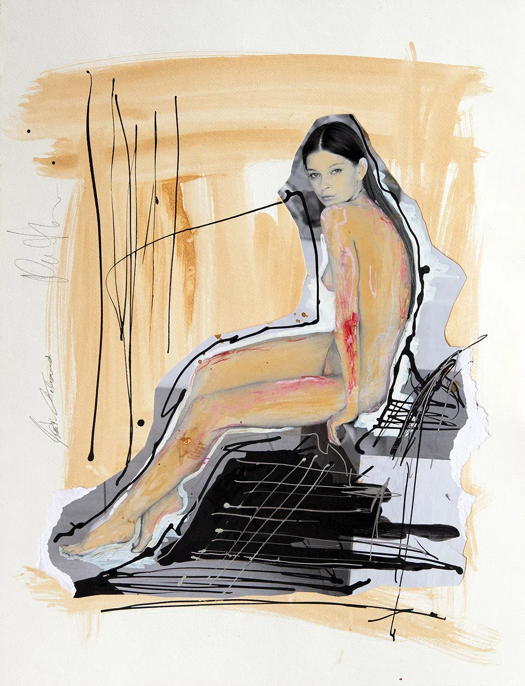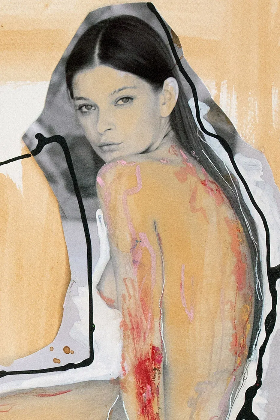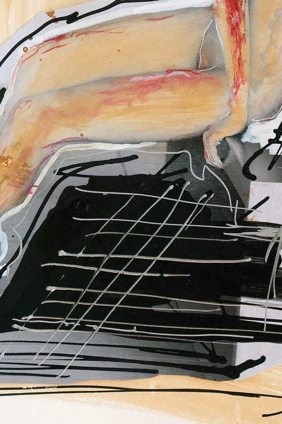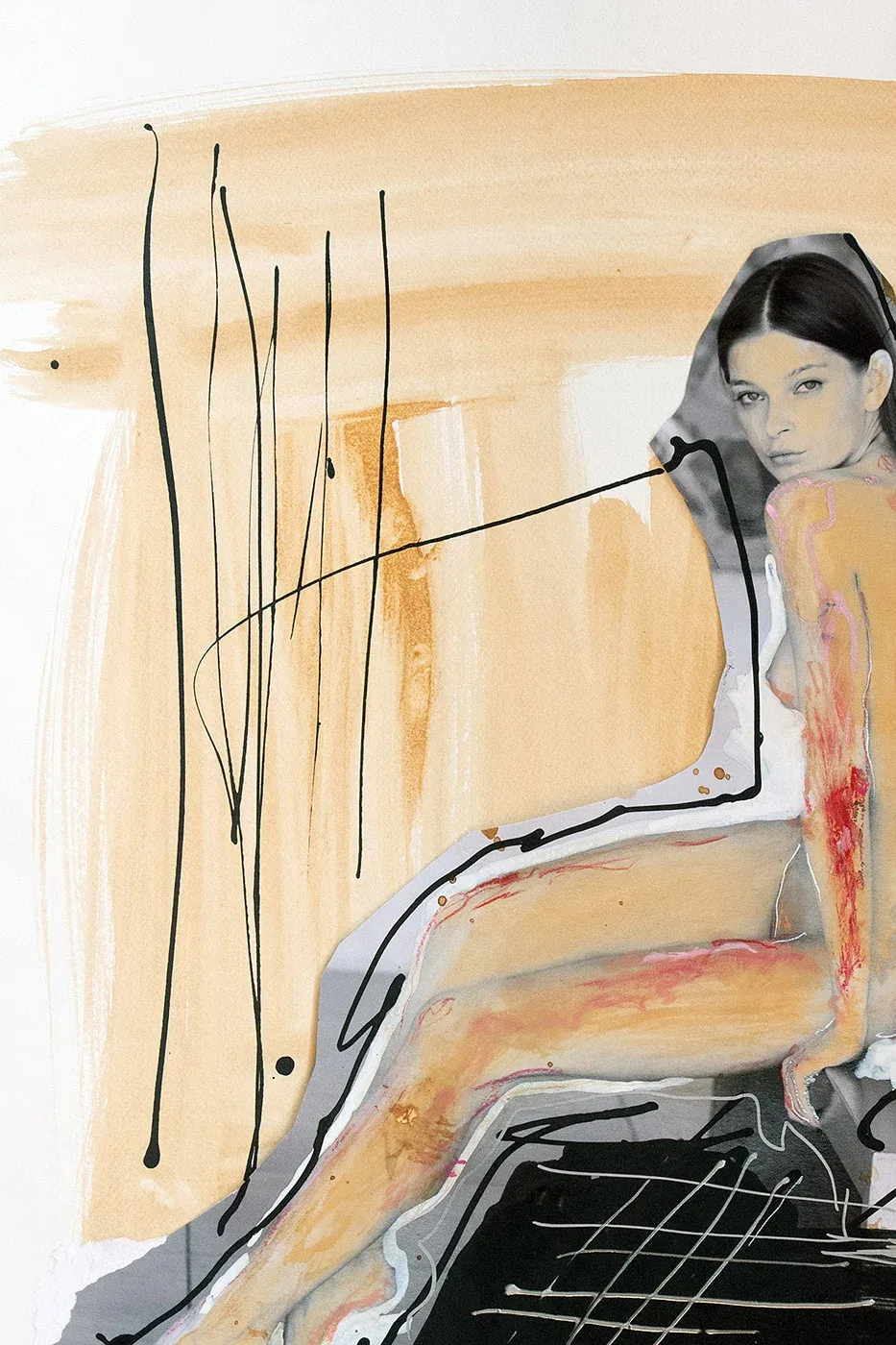 Ein Hauch von Bewegung im Stillstand. Der nackte Rücken, von Wachsmalstiften bearbeitet, als hätte jemand versucht, das Feuer einzufangen, das nicht erlöschen will. Die Tusche tropft wie Gedanken, die du nicht stoppen kannst. Zeitgenössische Collagenkunst, die zwischen den Linien lebt. Hier gibt es nichts Glattes. Nur die raue Oberfläche des Moments, in dem du dir eingestehst, dass du länger hinsiehst, als du solltest.