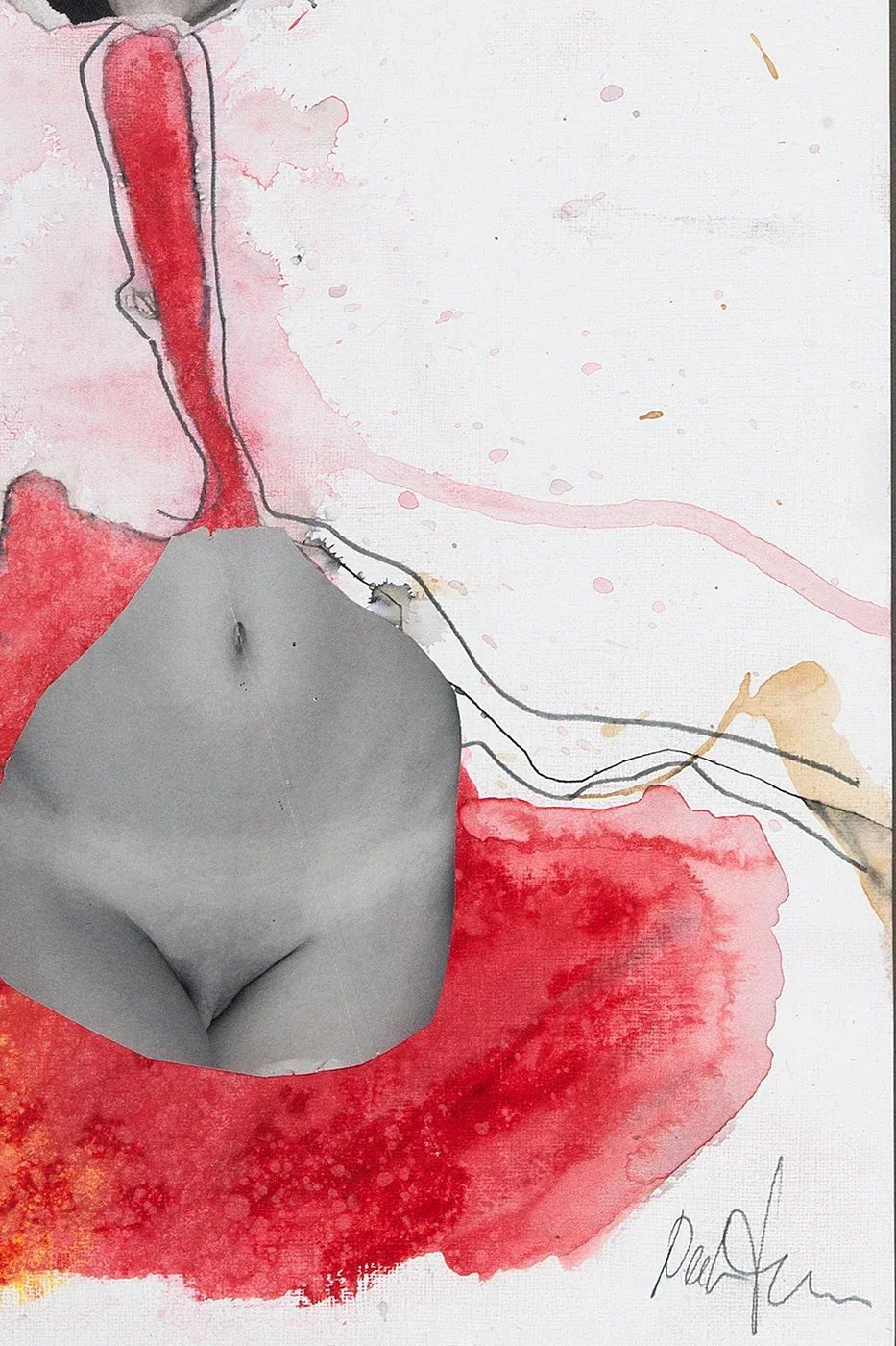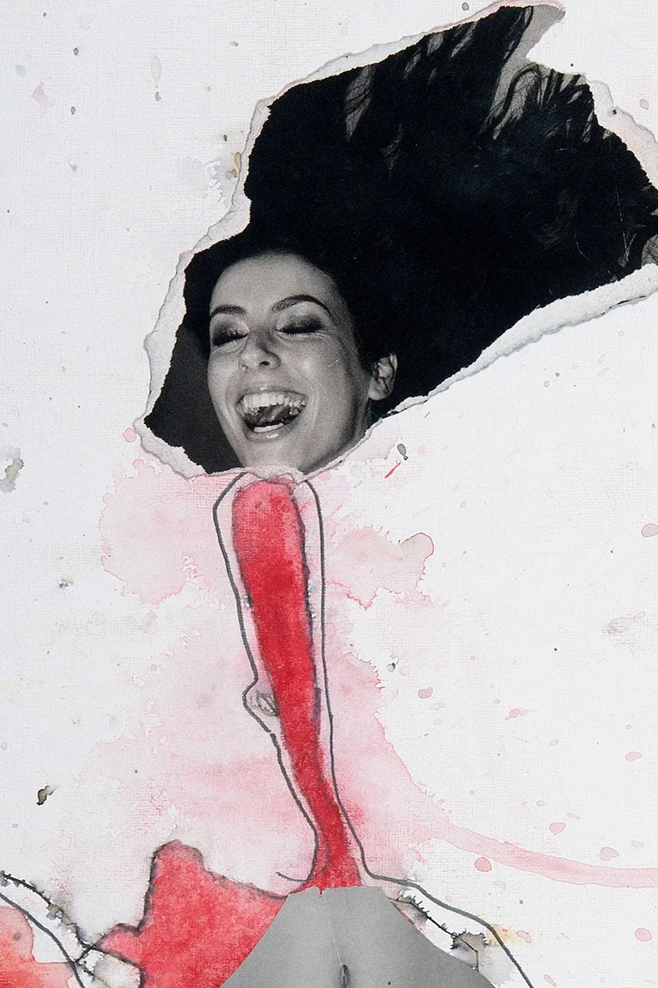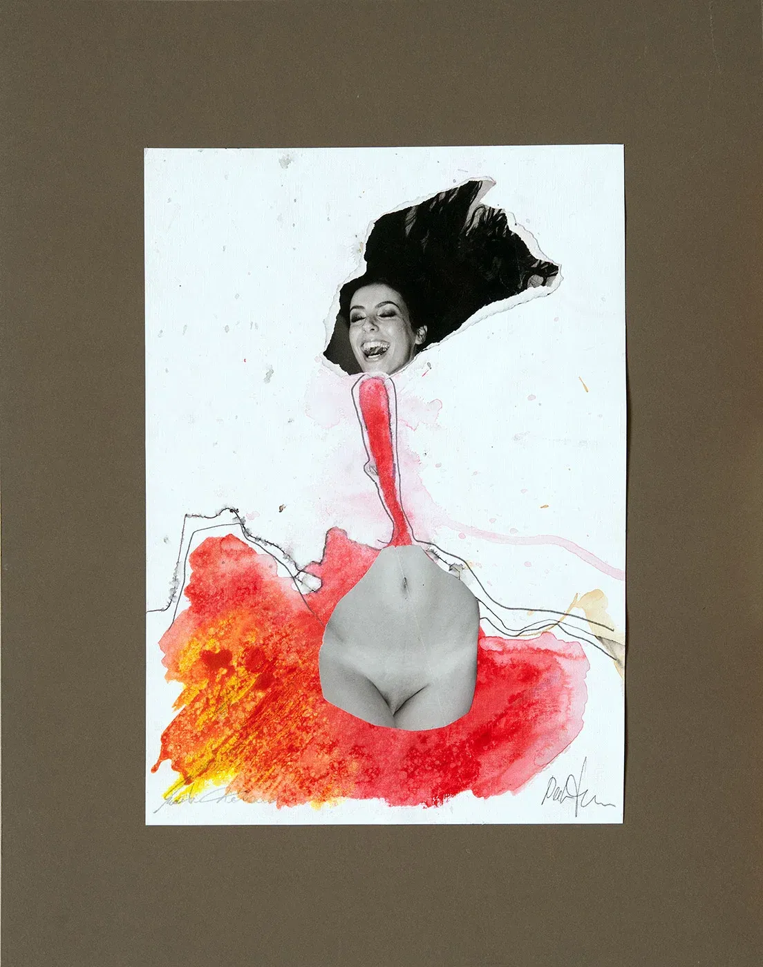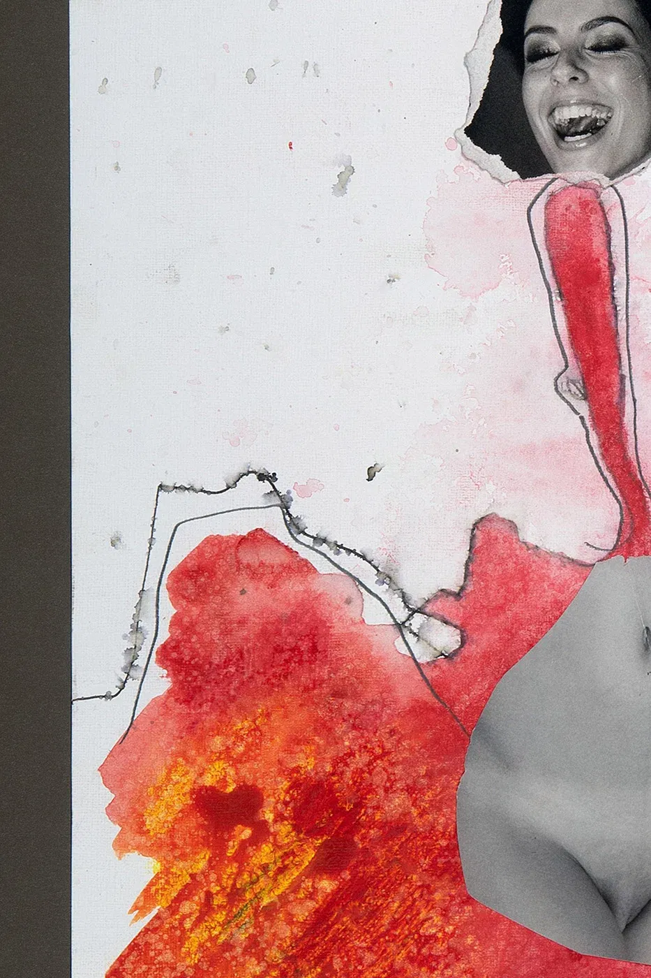 Das Gesicht lacht, während der Körper explodiert. Rot, orange, gelb – wie ein Sonnensturm, der keinen Bock auf Ordnung hat. Die Tusche zieht Linien, als wollte sie etwas festhalten, das längst in Flammen aufgegangen ist. Zeitgenössische Collagenkunst, die die rohe Freude einfängt, ohne sie zu verkleistern. Das Lachen ist echt, die Farben sind wild. Kunst, die dem Raum Energie gibt, weil sie nicht versucht, etwas vorzutäuschen. Es ist Freude, Verlangen, Chaos – festgehalten zwischen Papier und Fantasie.