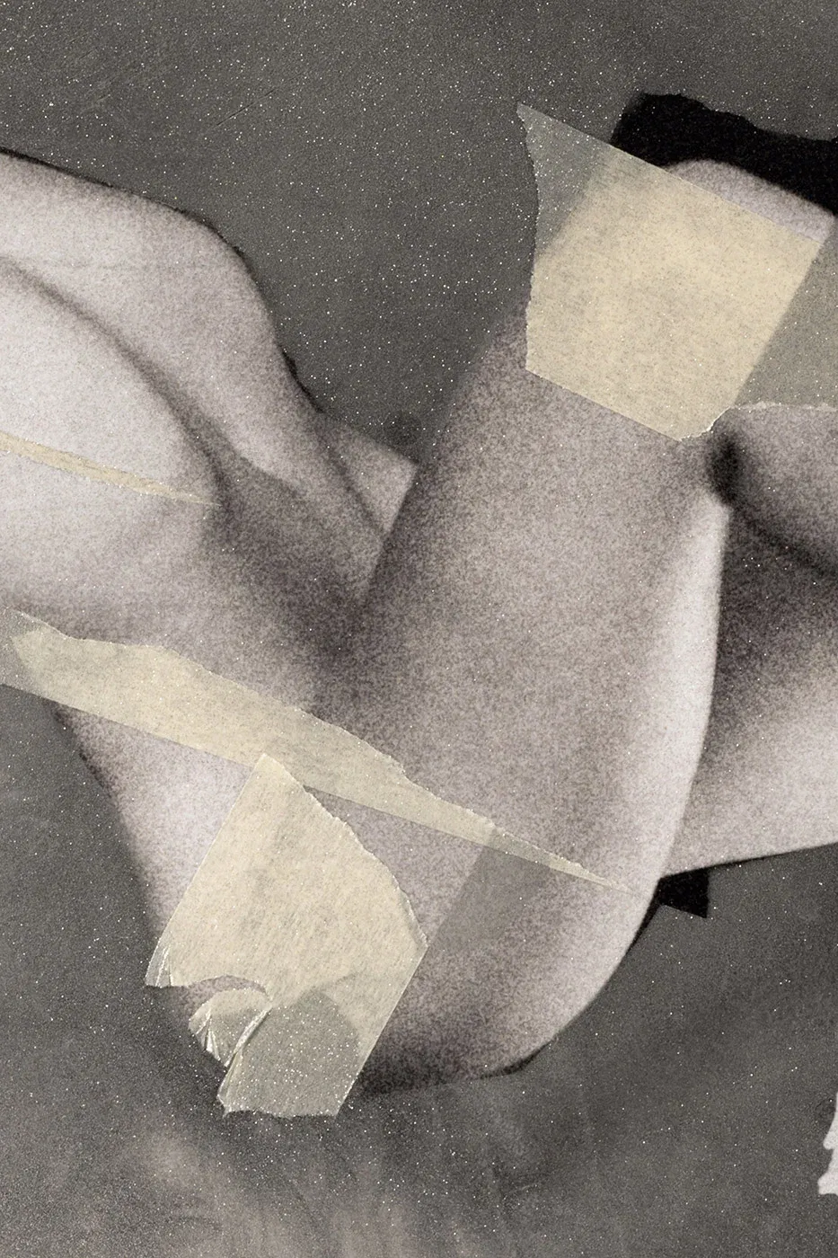 Zeitgenössische Collagenkunst mit einem fragmentierten Körper, gehalten von Tape und Schatten.